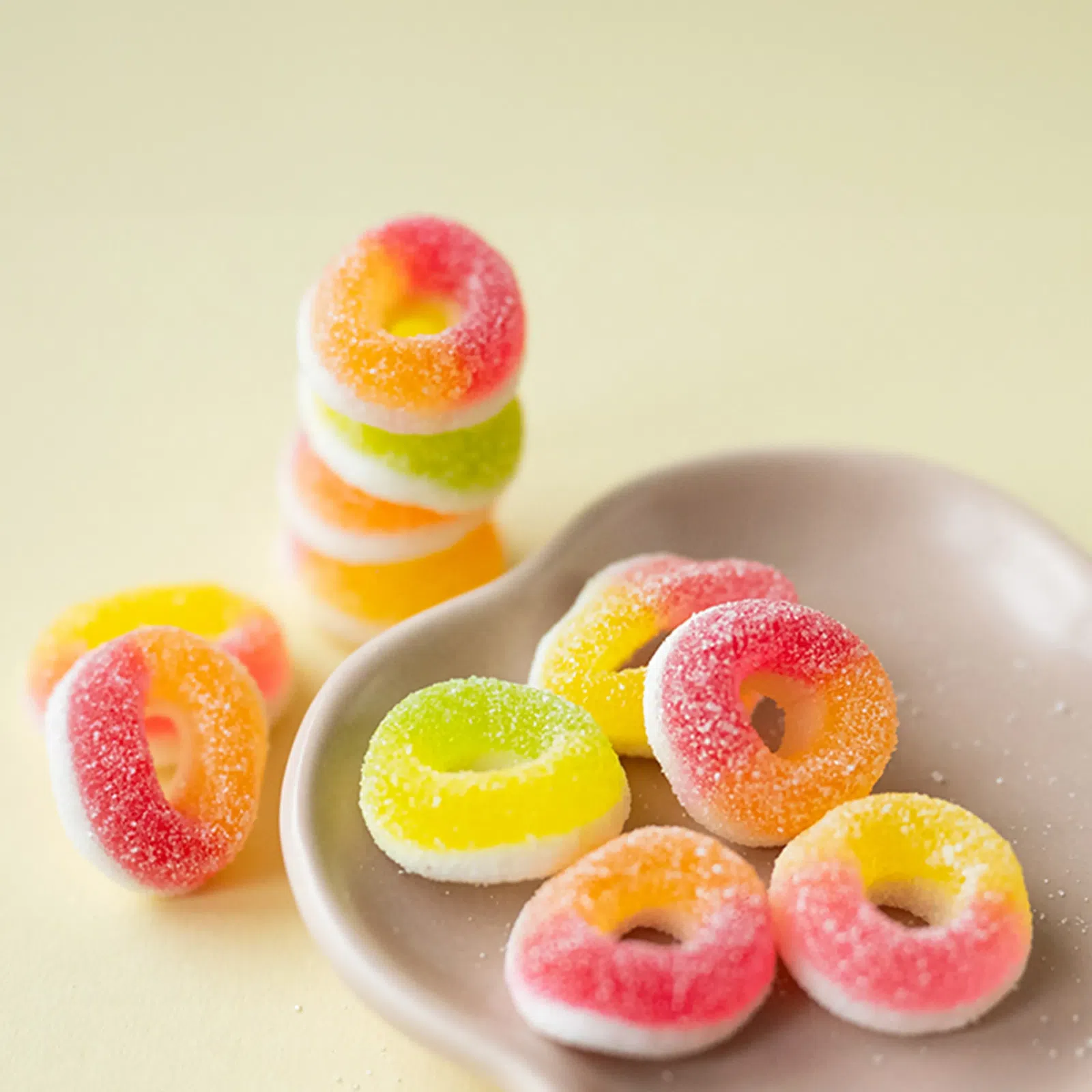 Dovedeme si představit, že občas máte chuť dát si něco jiného než sladké. To je naprosto v pořádku — místo cukrovinek můžete sáhnout třeba po něčem kyselejším. Co vy na to? Tohle želé s ovocnou příchutí by vaše choutky mohlo dokonale uspokojit. Kroužky jsou kombinací želé a pěny a navíc jsou obalené v kyselém posypu, takže přinášejí dokonalou rovnováhu chutí. Pyšní se různými ovocnými příchutěmi – můžete se těšit na ananas, jablko, třešeň, pomeranč, malinu a citron.