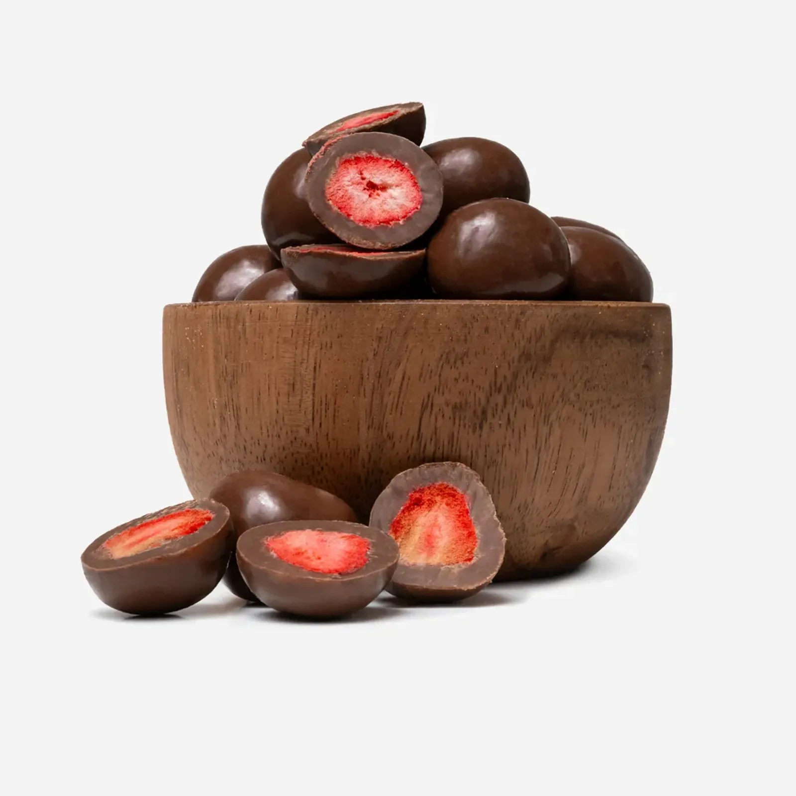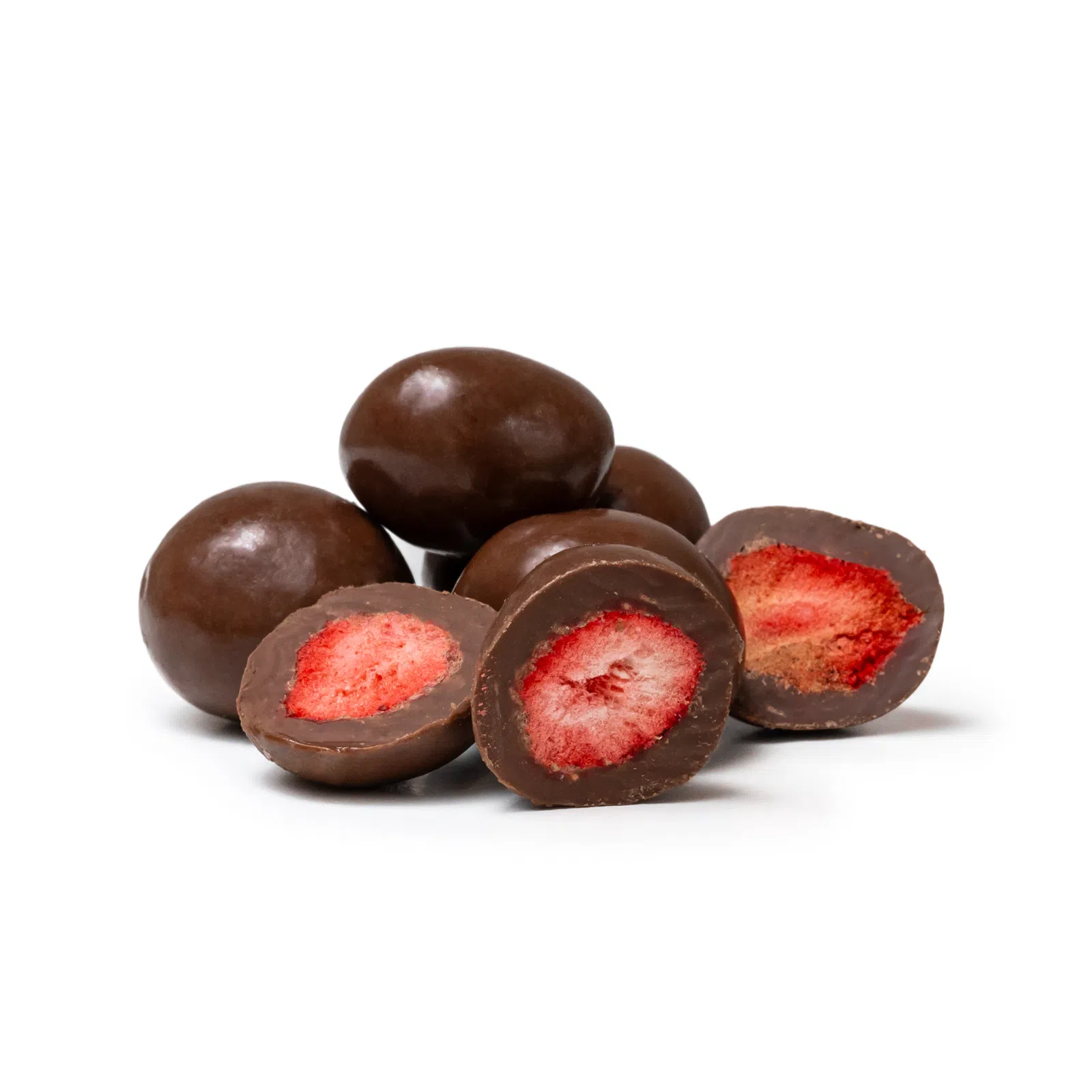 Mrazem sušené jahody obalené sladkou mléčnou čokoládou jsou tou pravou dobrotou pro všechny mlsouny. Dokonalá kombinace svěží ovocné chuti a jemné sladkosti.
