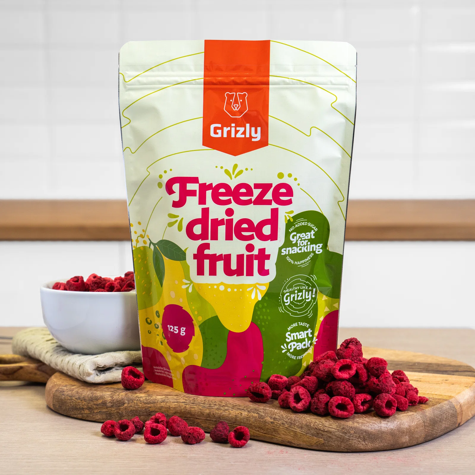 Mrazem sušené maliny GRIZLY představují lahodné a zdravé pochutnání. Díky znovuuzavíratelnému obalu zůstanou čerstvé a křupavé až do poslední porce.