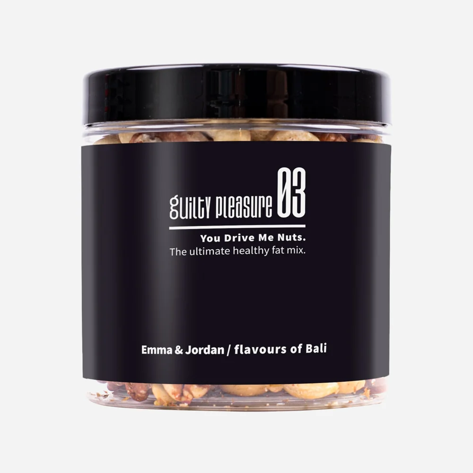 Konkrétně oříškovou směs by Emma & Jordan jsme namíchali z pekanových ořechů, kešu, makadamových ořechů a jader pistácií v různém poměru. A aby toho nebylo málo, přidali jsme ještě rozinky. Nebudeme zastírat, tenhle ultimátně dobrý, a hlavně zdravý mix vás přivede k šílenství. Doslova. Šíleně moc totiž budete toužit po každém dalším soustu. Z Guilty pleasure 03 se tak vyklube rychlá svačina, případně skvělé ochucení různých zeleninových salátů.