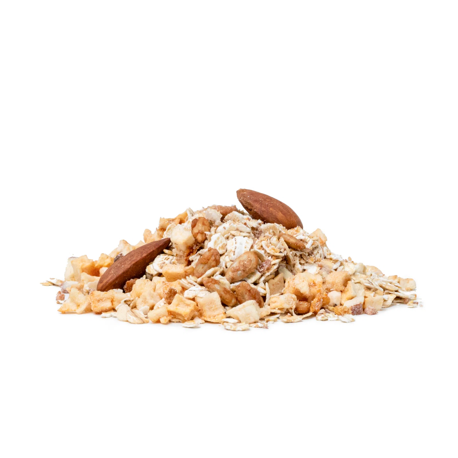 | Složení: | ovesné vločky bezlepkové s klíčky 47 %, zlomky mandlí ve skořici 28 % (mandle 76 %, cukr, skořice 3,5 %), sušená jablka 12 %, sušená třtinová šťáva, slunečnicová semínka ve skořici a cukru (semena slunečnice 76 %, cukr, skořice 3,5 %). |