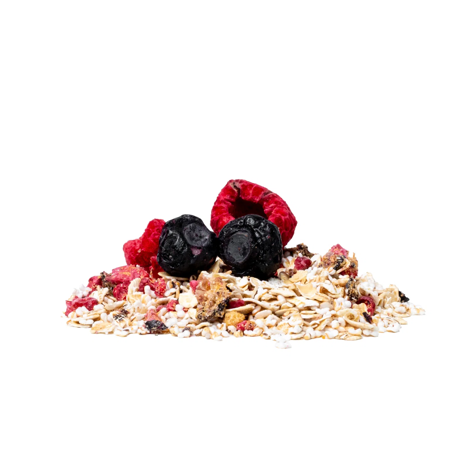 Jako vždy – ze samých dobrých věcí! Kousky mrazem sušených borůvek a malin doplňují bezlepkové ovesné vločky s klíčky, které jsou v porovnání s nenaklíčeným zrnem pro naše tělo daleko lépe stravitelnější. Ve složení kaše pak najdete ještě chia semínka, pufovaný amarant a sušenou třtinovou šťávu.