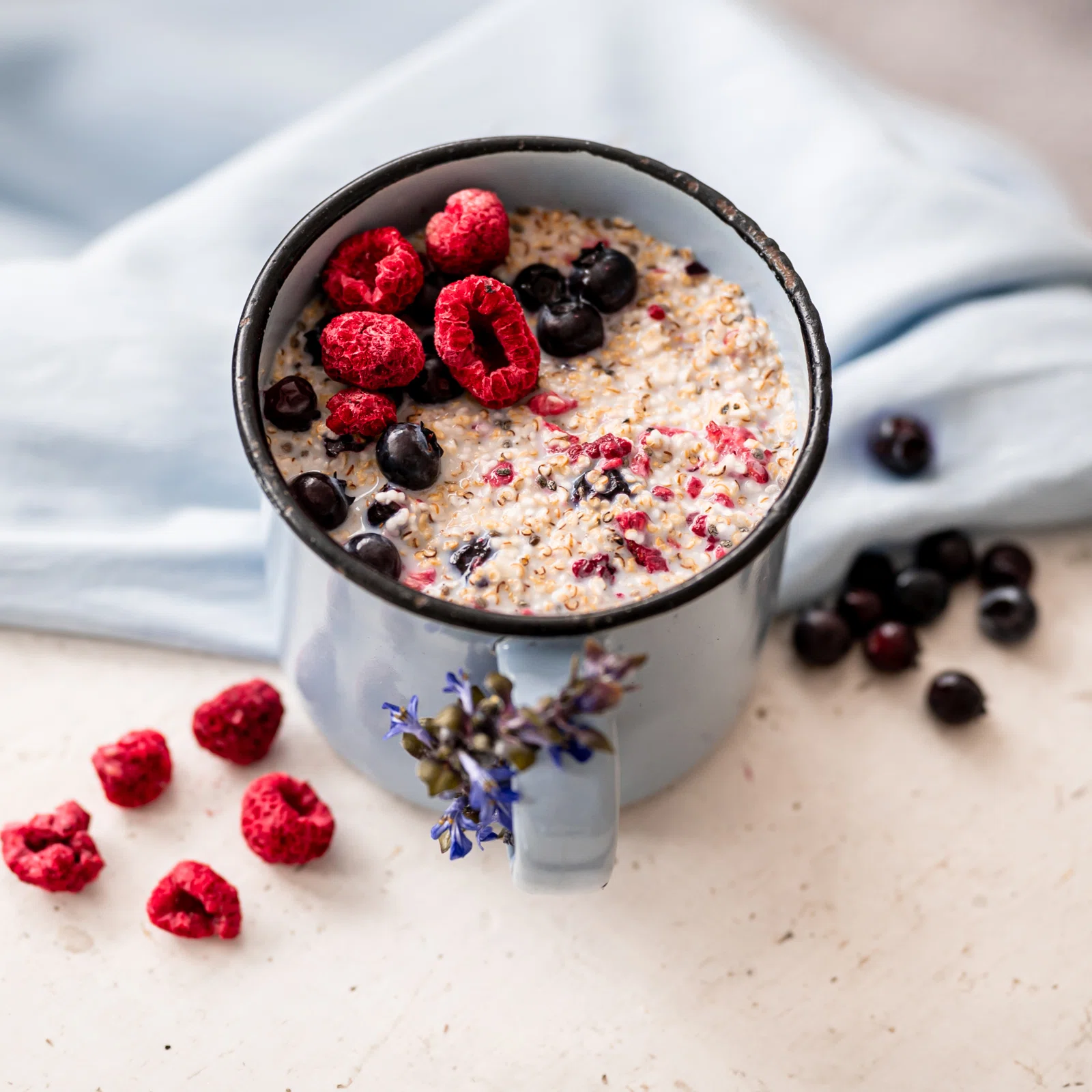 Jestli věčně nemáte času nazbyt, pak se vám určitě bude hodit tip na rychle připravenou snídani nebo svačinu. Nese jméno bezlepková ovesná kaše a na stole vám přistane během několika chvil. Bleskurychlá příprava ovšem není jediným plusem, kterým si vás tahle kaše získá. Dostane vás především svou chutí, jíž dominuje kombinace mrazem sušených borůvek a malin doplněná například o chia semínka. Ta jsou mimochodem skvělým zdrojem vlákniny. Navíc jsme pro výrobu kaše zvolili bezlepkové vločky s klíčky, které jsou jemnější a lépe stravitelné. Borůvkovo-malinová kaše je bezmléčná, takže si ji ke snídani mohou připravit i ti z vás, které trápí intolerance na mléko.