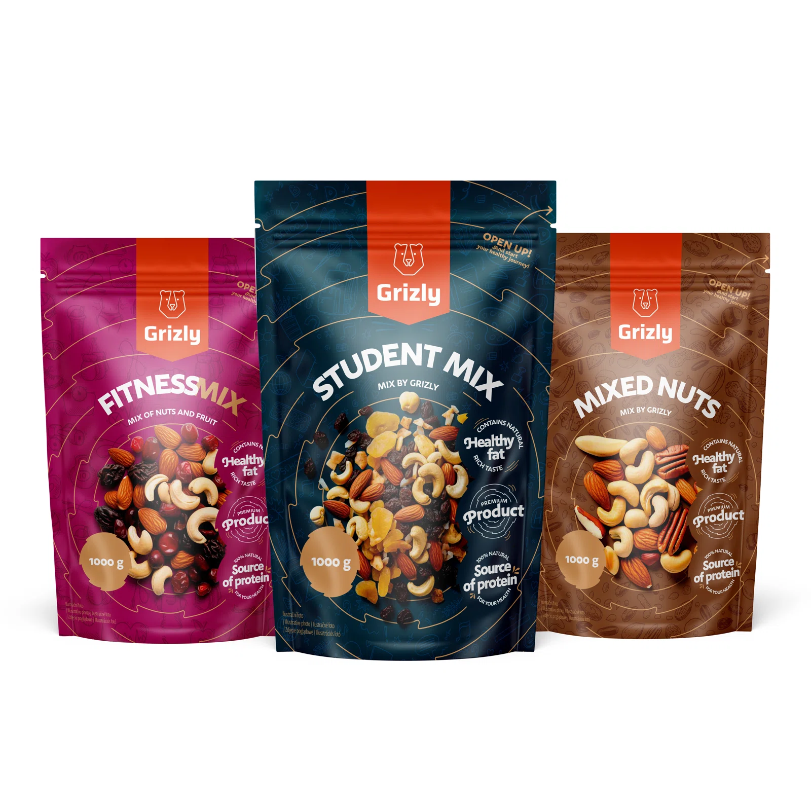 Osvědčená kombinace mandlí, arašídů, rozinek, kešu, ananasu a lískáčů dělá ze studentské směsi Grizly skvělou rychlou svačinku. V našem mixu najdete ideální poměr oříšků a sušeného ovoce. Tato lahodná kombinace dodá vašemu tělu potřebné živiny a povzbuzení, ať už jste student, nebo ne. Díky praktickému znovuuzavíratelnému sáčku, ve kterém je studentská směs zabalena, ji budete mít vždy po ruce – ať už vás přepadne chuť během přednášky, nebo si ji ráno nasypete do müsli či kaše.