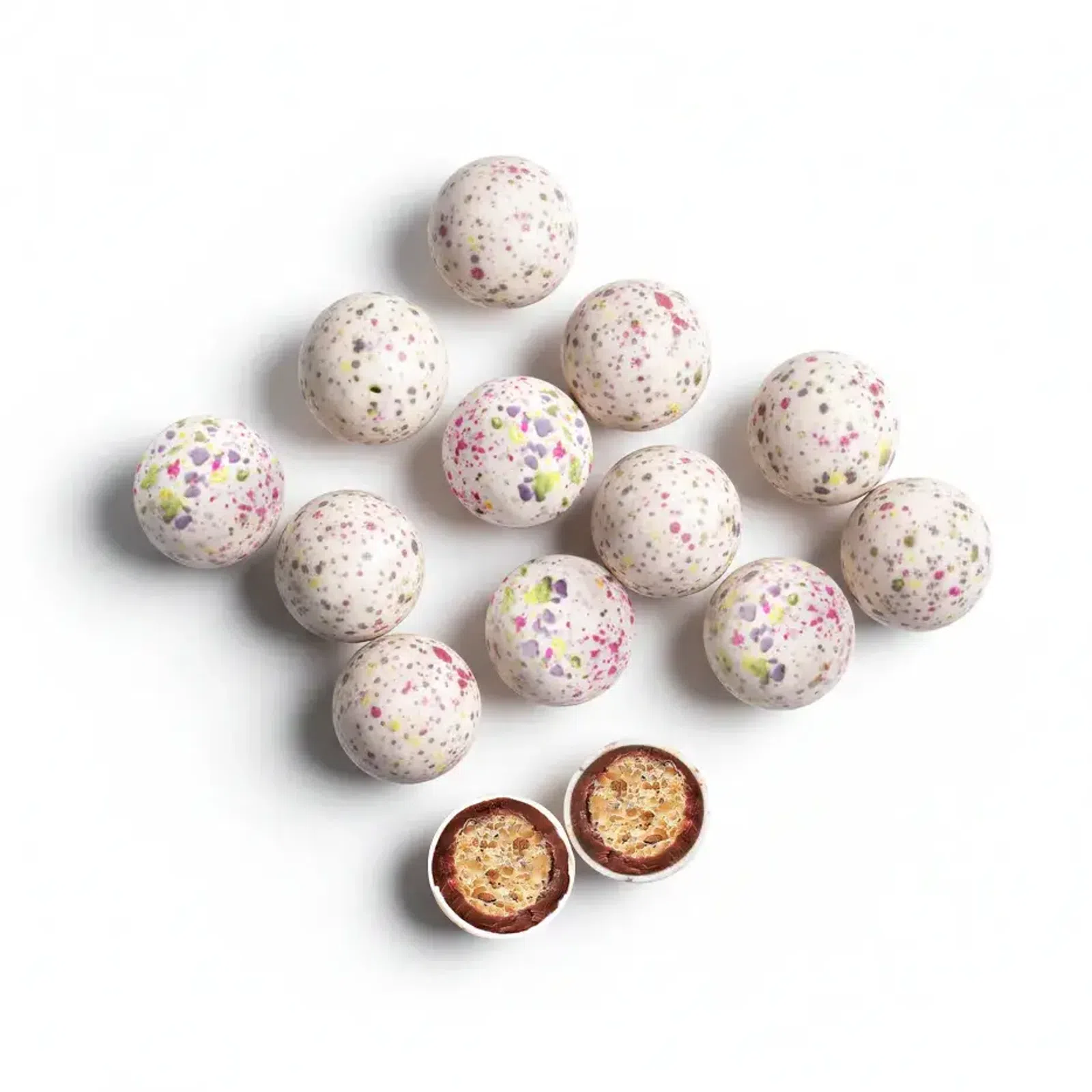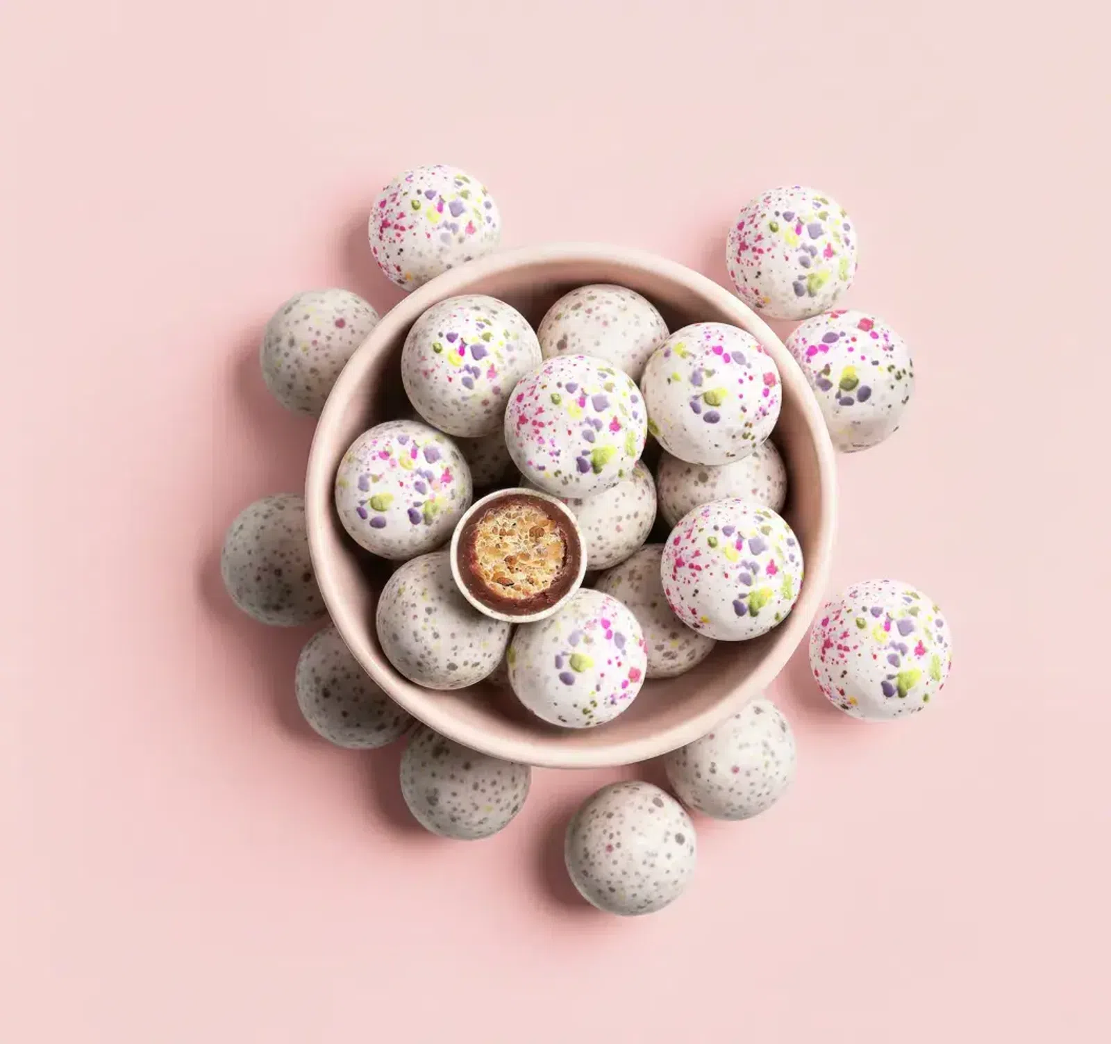 Malé kuličky plné jara a radosti. Velikonoční křupavé dražé ukrývá lehkou křupinku, která je obalená v poctivé vrstvě mléčné čokolády a chráněná pevnou cukrovou skořápkou. Každá kulička hraje barvami jara a nabízí dokonale vyváženou kombinaci křupavosti a čokoládové jemnosti. Ideální velikonoční výslužka pro koledníky, sladká dekorace na sváteční stůl i radostné mlsání jen tak doma. Protože Velikonoce chutnají nejlépe, když jsou barevné a křupavé.