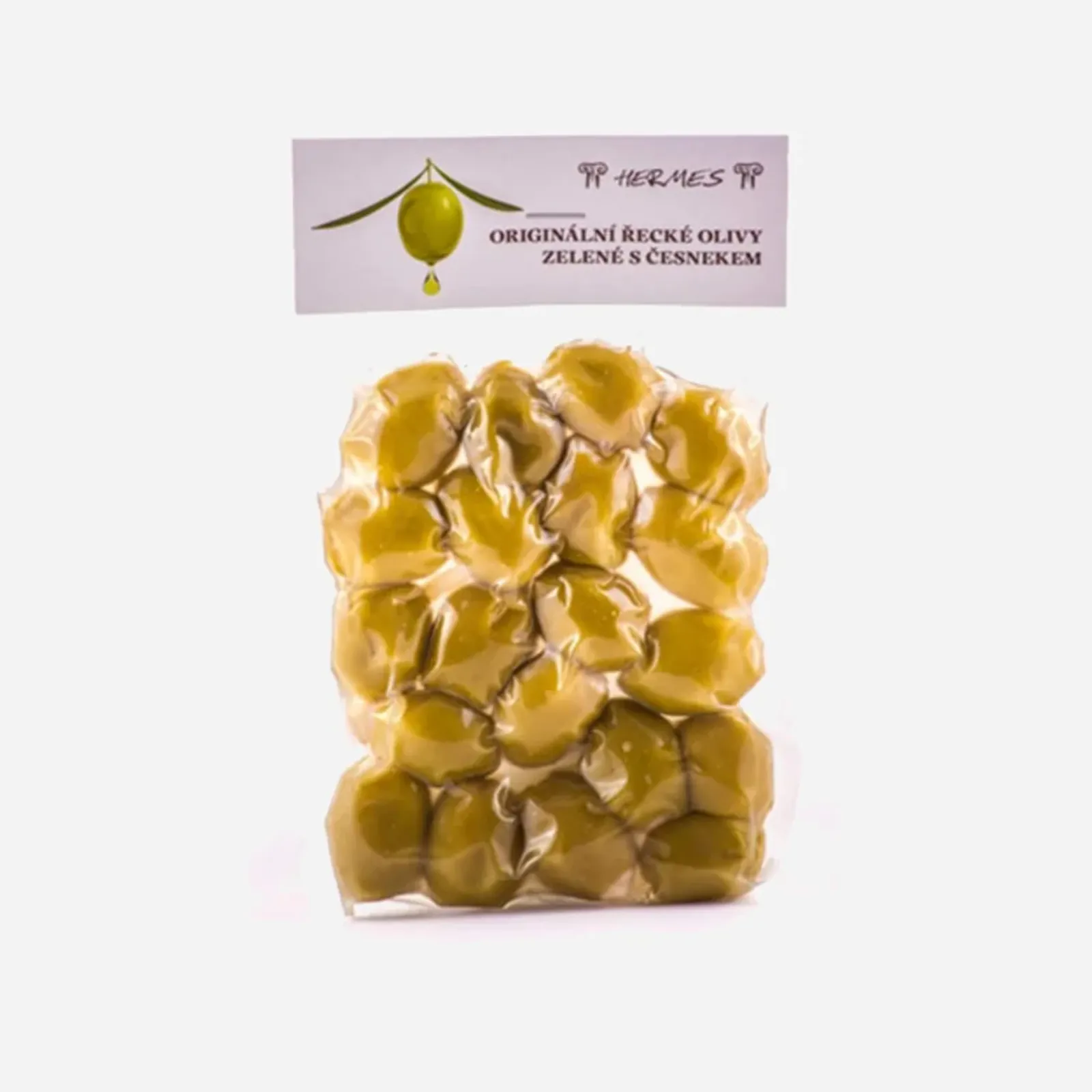 Vypeckované olivy plněné česnekem uskladněné ve vakuovém sáčku. Olivy jsou plněny ručně a jsou velmi delikátní.