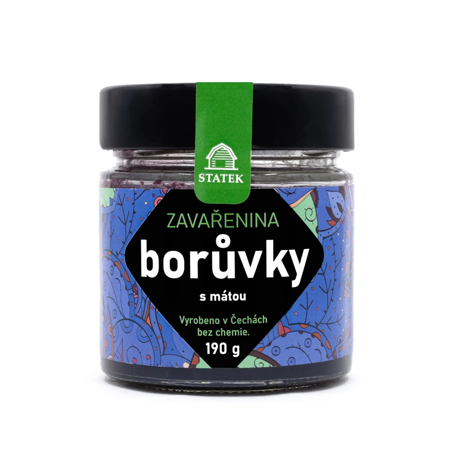 Složení: borůvky min. 72 %, řepný cukr max. 25%, máta min. 1,9%, citrusový pektin.