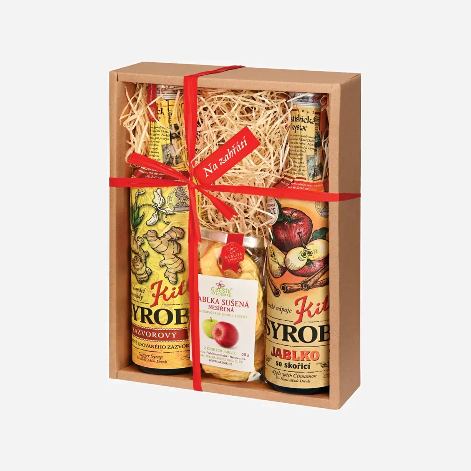 Limitovaná edice dárkového balení sirupů na zahřátí, která obsahuje Horký Kitl Jablko se skořicí 500 ml, Kitl Syrob Zázvor 500 ml a křížaly z jablek v BIO kvalitě 50 g.