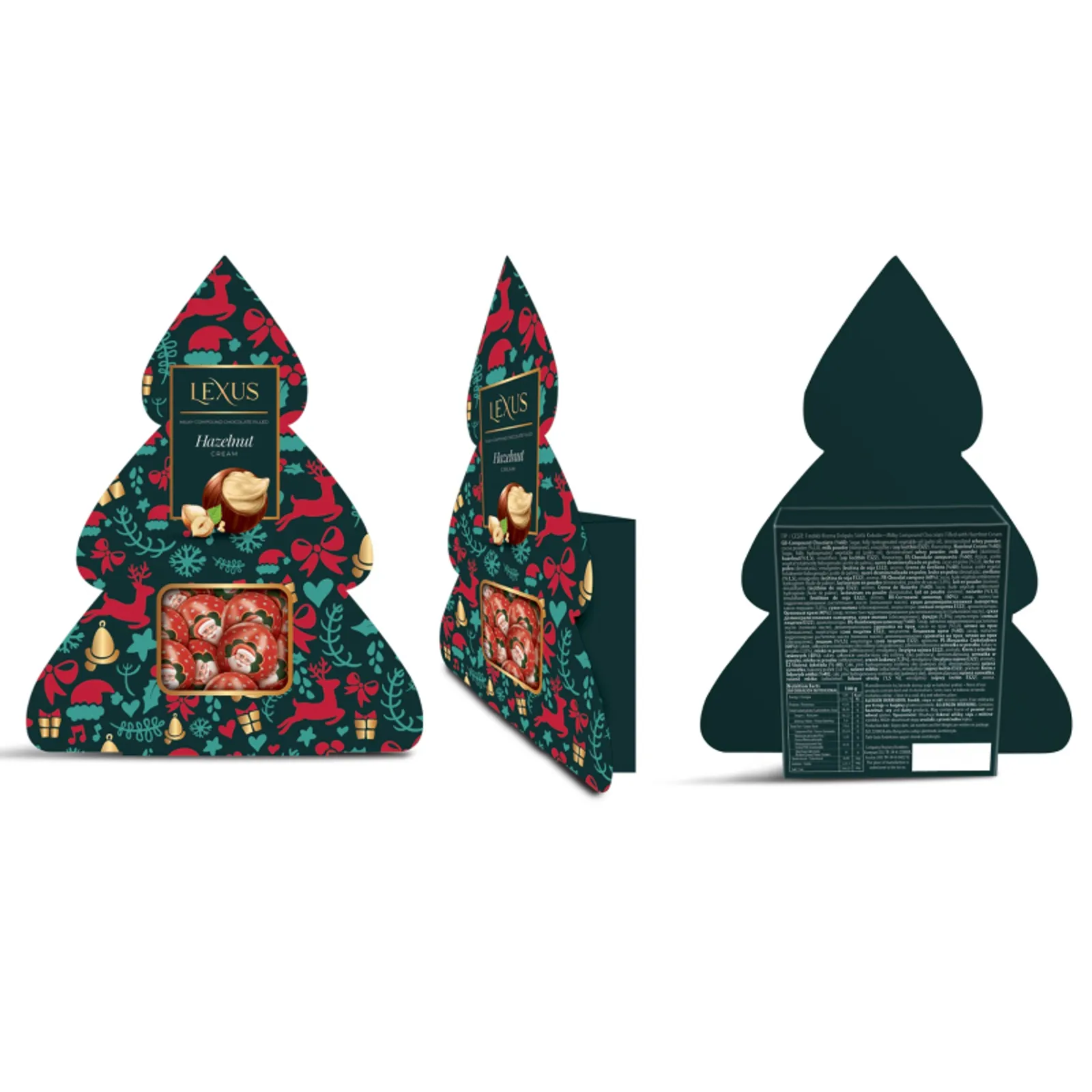 Lahodné čokoládové kuličky s lískooříškovým krémem jednotlivě baleny do vánočního přebalu a celé v blistru ve tvaru vánočního stromečku.