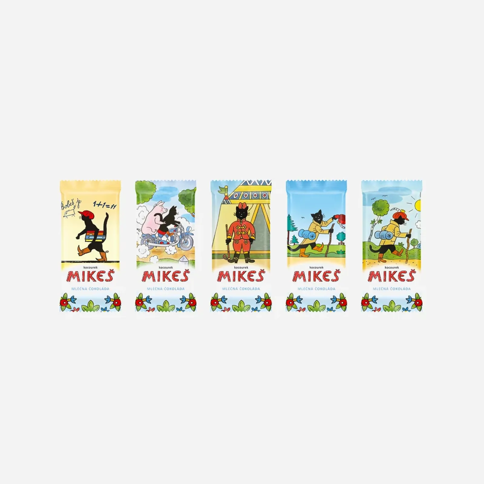 Mléčná čokoláda, která potěší nejen mlsné jazýčky. Každá čokoládička má na obalu jeden z pěti obrázků kocourka Mikeše v různých veselých situacích. Nejvíce ji ocení děti, ať už jako sladkost nebo pro doplnění energie na výletech či ve škole.
