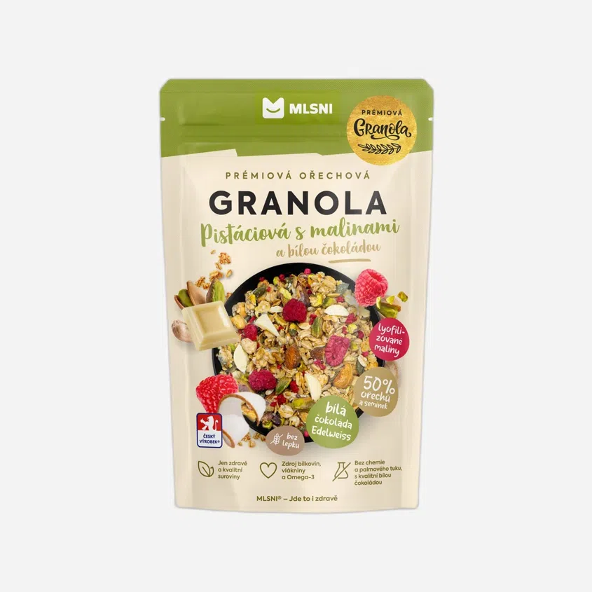 Tato zamilovaná speciálka prémiové granoly od MLSNI spojuje jemně křupavé pistácie s ovocnou svěžestí malin a luxusní sametovou bílou čokoládou Edelweiss.