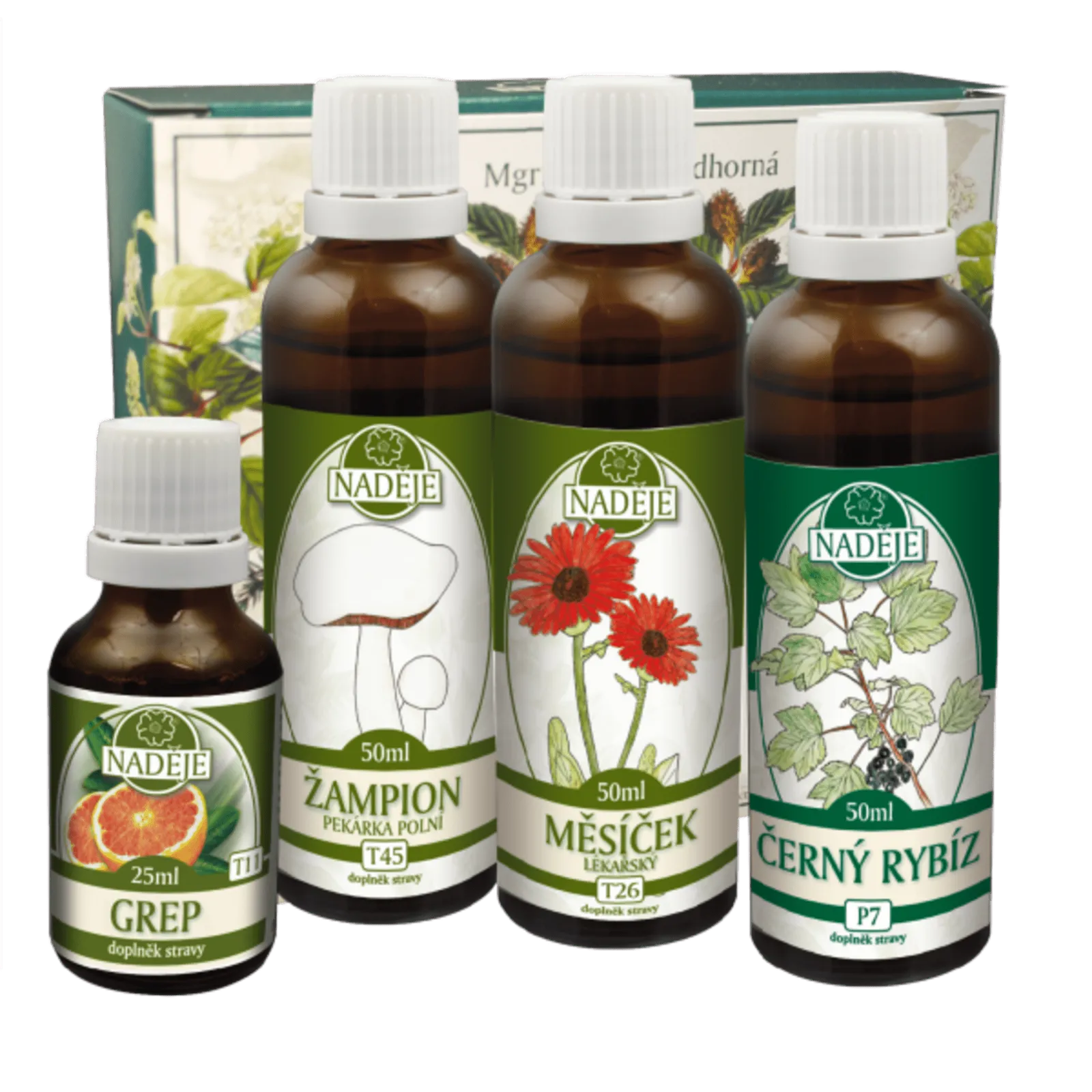Dávkování: Současně užívat žampion, měsíček a grep, po využití lahvičky grepu vezmete černý rybíz a vše doužívat.