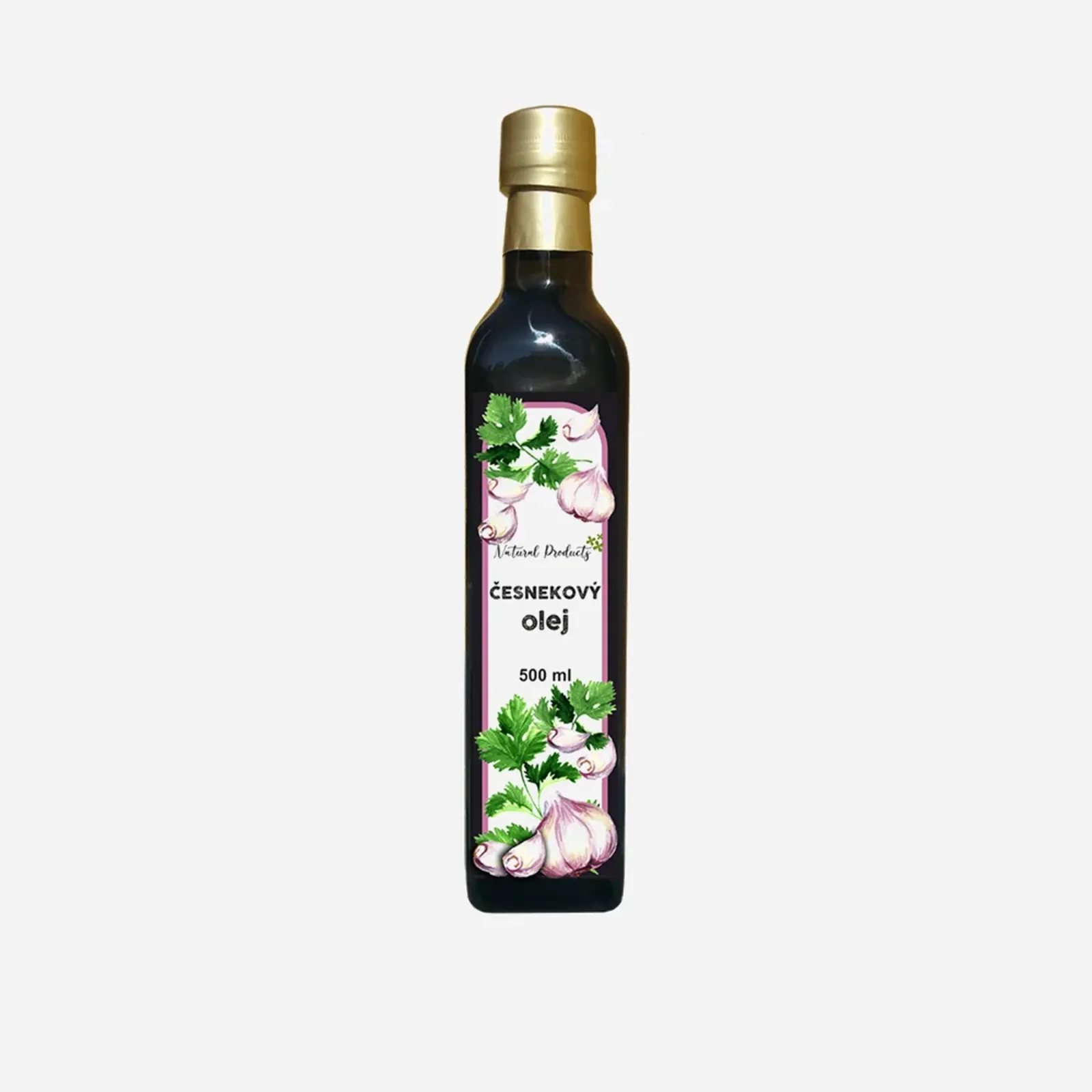 Vlastnosti a výhody: Na výrobu tohoto oleje se používá slunečnicový za studena lisovaný, nerafinovaný, nefiltrovaný, pouze přirozeně sedimentovaný olej té nejvyšší kvality vyrobený z loupaného slunečnicového semínka. Dále je při výrobě použitý sušený mletý česnek. Ochucené oleje jsou vyráběny metodou výluhu dané suroviny v za studena lisovaném slunečnicovém oleji a jsou určeny pro kuchyňské využití. Složení: slunečnicový