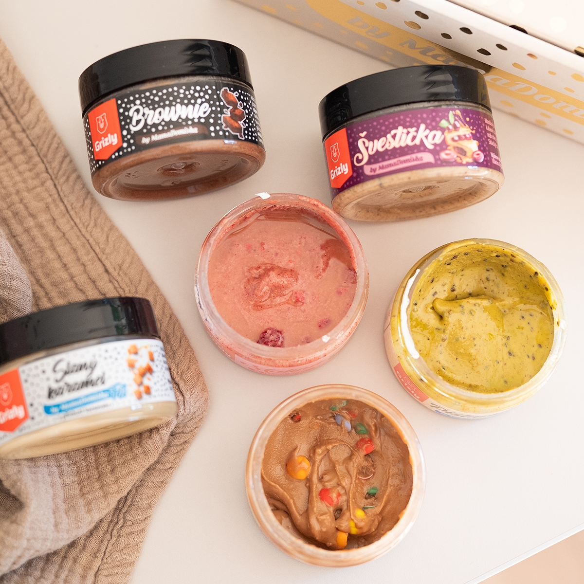 Každopádně náš Ochutnávkový set je takovou vstupenkou jistoty do GRIZLY světa by @mamadomisha. Najdete v něm ovocnou zahrádkou inspirované krémy Švestička a Malina, barevnou Lentylkádu nebo skrz na skrz zelenou Pistachiu. Sestavu doplňují stálice Slaný karamel a Brownie. Nezapomněli jsme ani na FIT nadšence a do setu přibalili FIT verzi Slaného karamelu, Pistachie a White Brownie. Jak vidíte sami, je opravdu z čeho vybírat. Vsadíme se, že až vám Ochutnávkový set přijde domů, nebudete vědět, do které skleničky se pustit dříve.