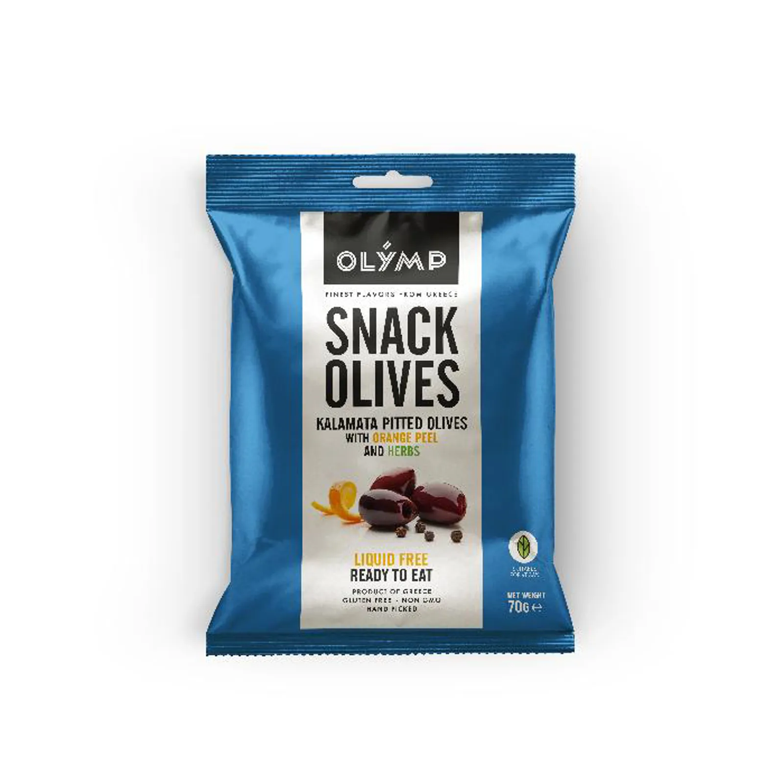 Prémiové olivy Kalamata bez pecky s jemnou chutí pomerančové kůry a bylinek. Díky praktickému balení bez nálevu jsou ideální pro rychlou a zdravou svačinu kdykoliv a kdekoliv.
