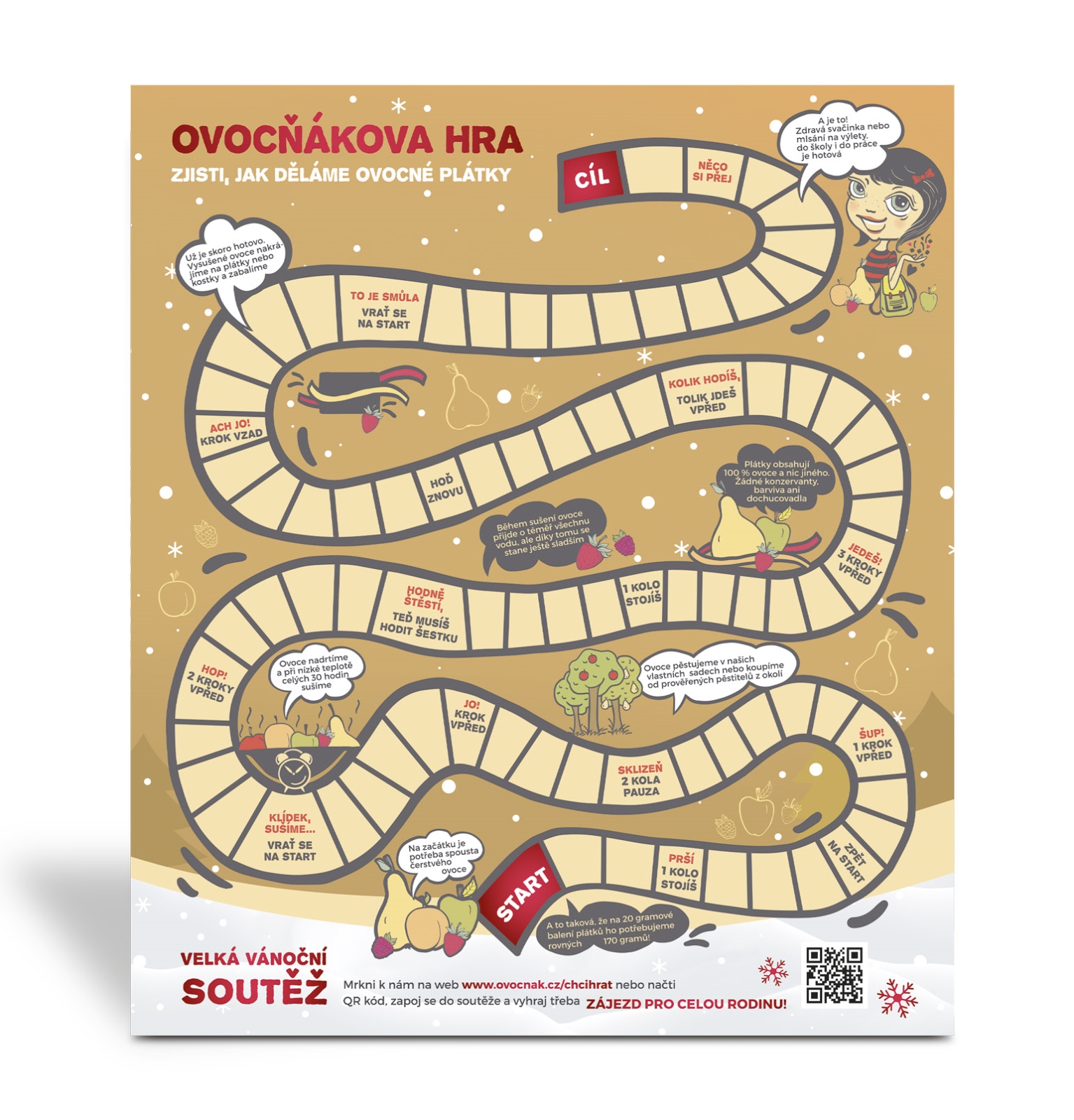 Na Štědrý den ho čeká hračka v podobě 14 ovovíček s návodem na poskládání želvy nebo bagru a oči se rozzáří těm co si rádi hrají, protože na zadní strana kalendáře hra pro celou rodinu s příběhem o tom, kolik práce je za tím, než vyrobíme ovocné plátky!