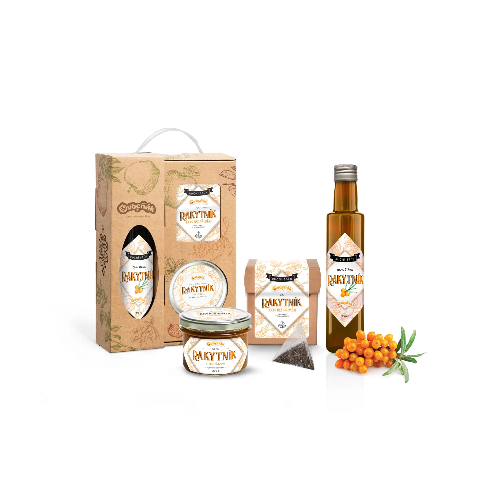 Potěšte své nejbližší a obdarujte je speciální dárkovou edicí s rakytníkovými produkty. Rakytník je oblíbený zdroj vitamínu c. Dárkové balení obsahuje 100% rakytníkovou šťávu, 100% rakytníkový čaj a rakytníkový džem s hruškou.