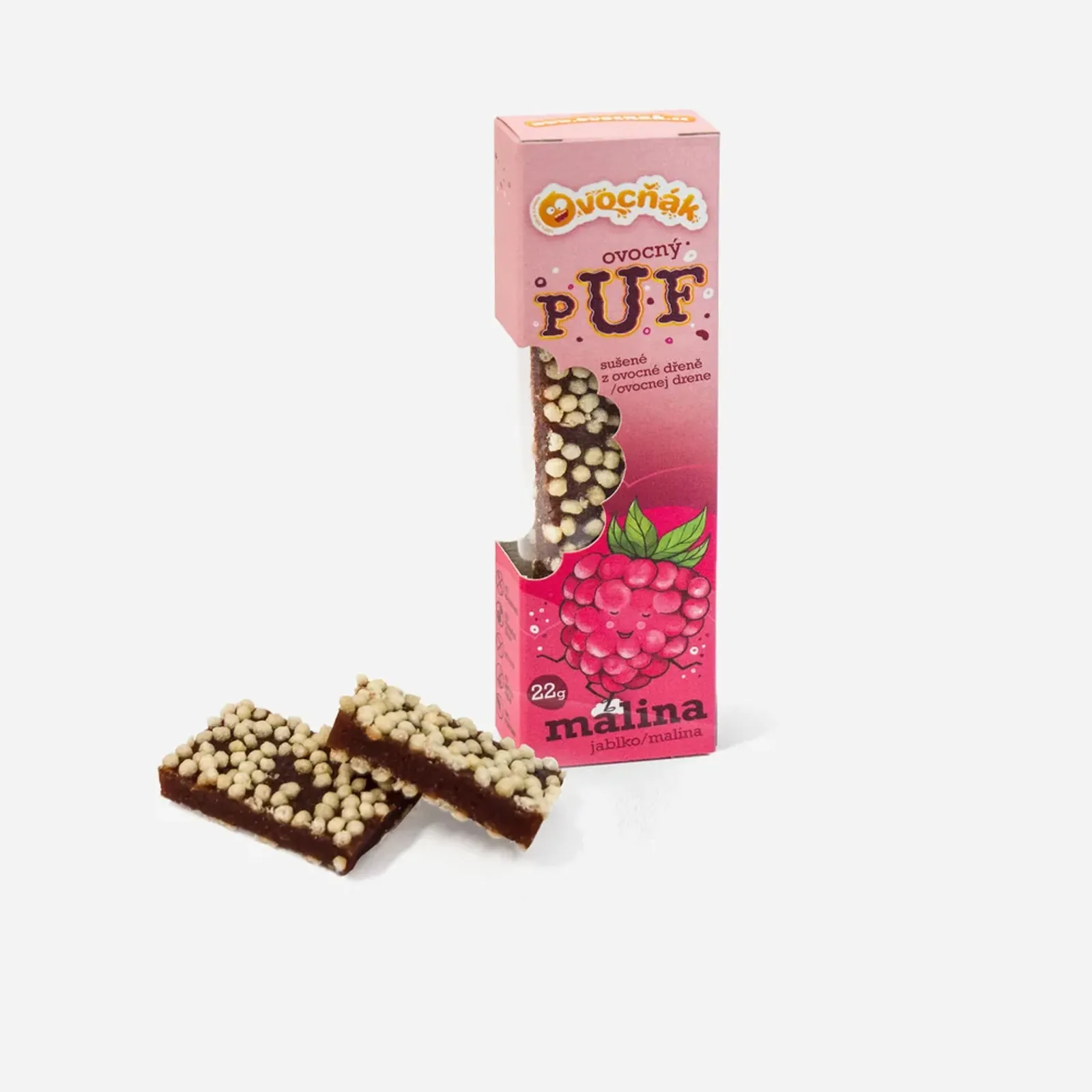 Ovocné pufy jsou v rodině Ovocňáku nové. Vznikly tak, že v Ovocňáku dřeň z ovoce zasypali extrudovanou (pufovanou) rýží a plátky usušili společně za nízkých teplot. Díky tomu si i pufy zachovávají většinu výživných látek, které obsahuje čerstvé ovoce. Vrstva rýžových pufíků jim pak zajišťuje kromě křupavosti to, že můžete vzít snadno do ruky, protože nelepí. A to nejlepší na konec: křupavé jsou prostě zábavné, protože jak děti, tak dospělí prostě rádi křupou! Stejně jako plátky jsou sytá a energeticky bohatá sváča, která se nerozpustí a neslisuje, takže ideální na výlety nebo do aktovek.