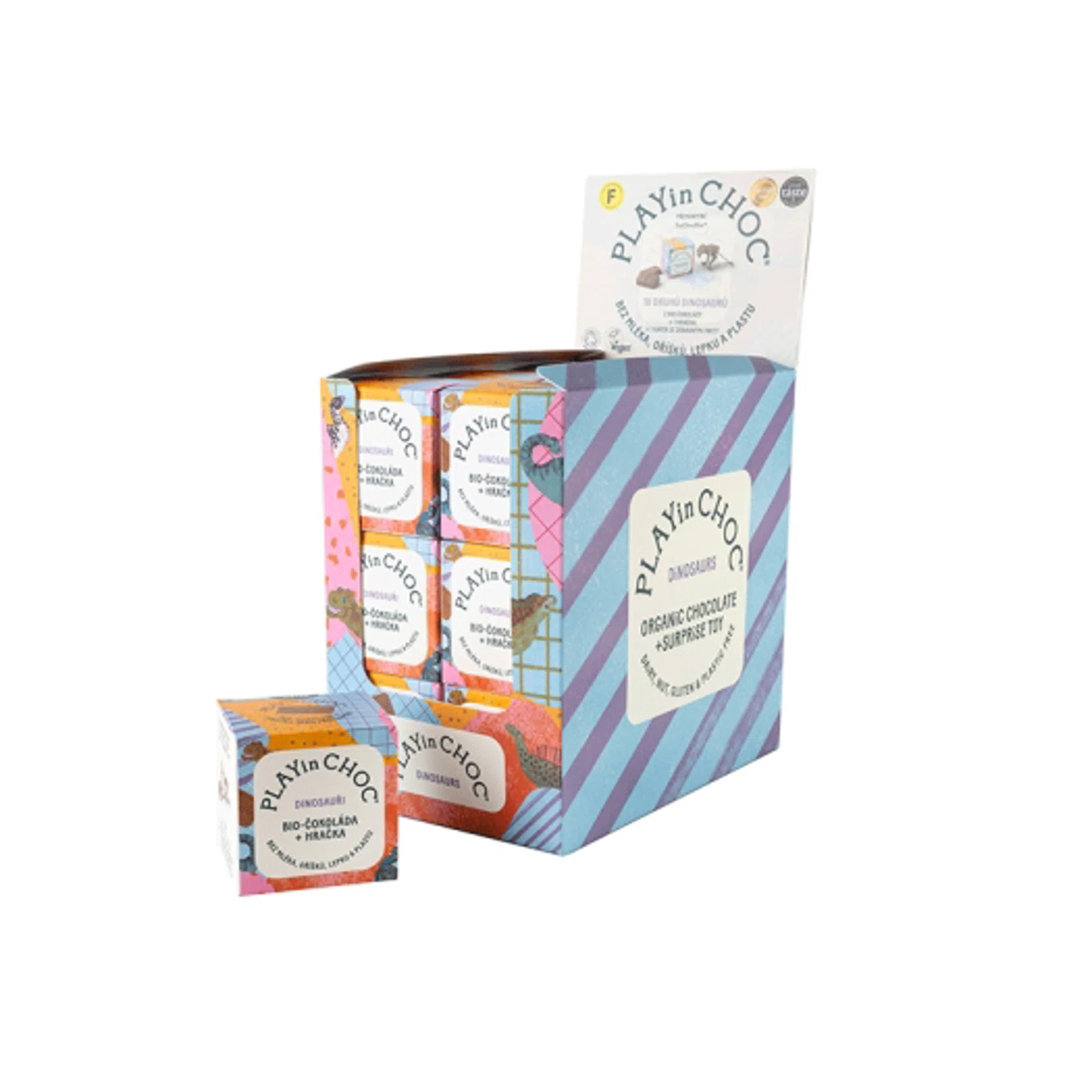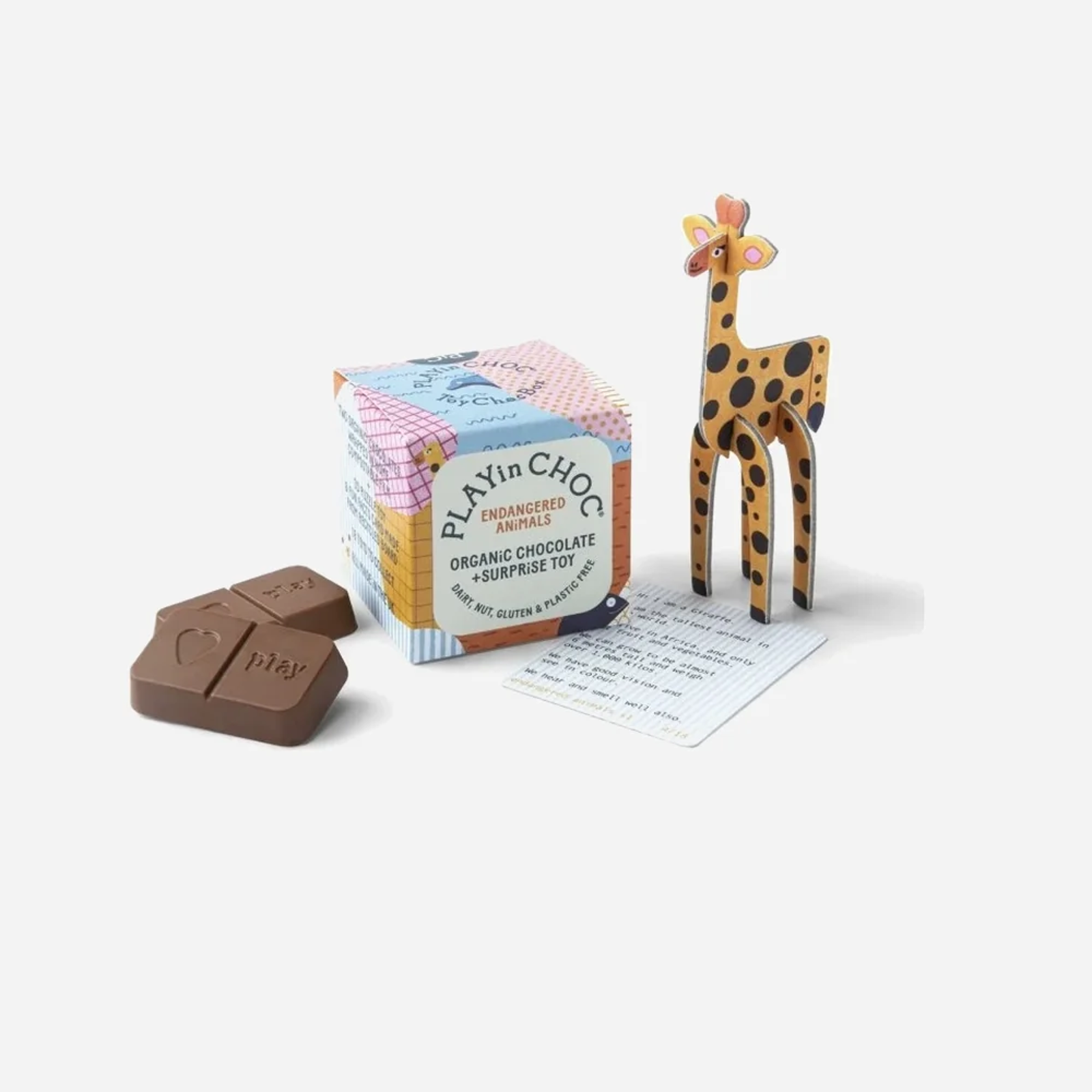 Krabička PlayIn Choc ToyChoc obsahuje dvě jednotlivě zabalené, lahodně krémové, organické čokolády bez mléka, 3D kartonovou skládačku k sestavení a zábavnou kartičku s fakty.