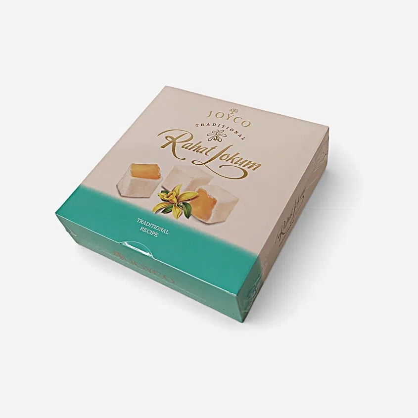 Tradiční sladkost z blízkého východu Rahat-Lokum s lahodnou vanilkovou chutí. Vyrobeno z cukru a škrobu, obalené v moučkovém cukru.