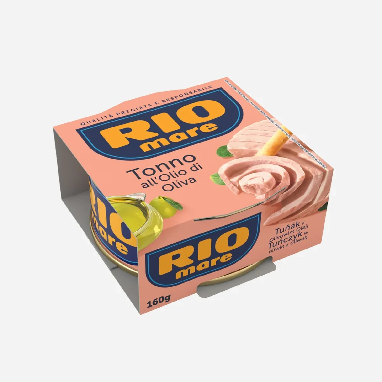 Sterilovaná konzerva z tuňáka pruhovaného v olivovém oleji značky Rio Mare.