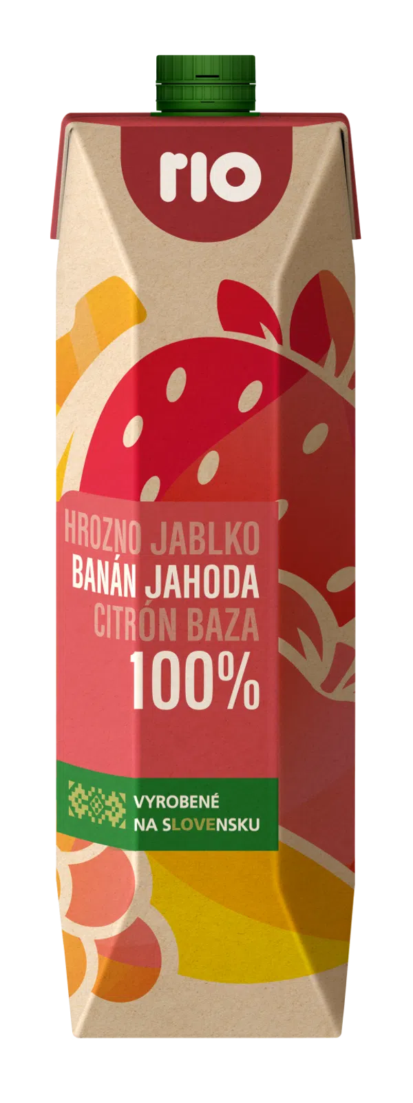 Rio 100% vícedruhová ovocná šťáva vyrobená z koncentrátů, pyré, šťávy lisované za studena a dření, s banánem a jahodou v ekologickém obalu z obnovitelných zdrojů.