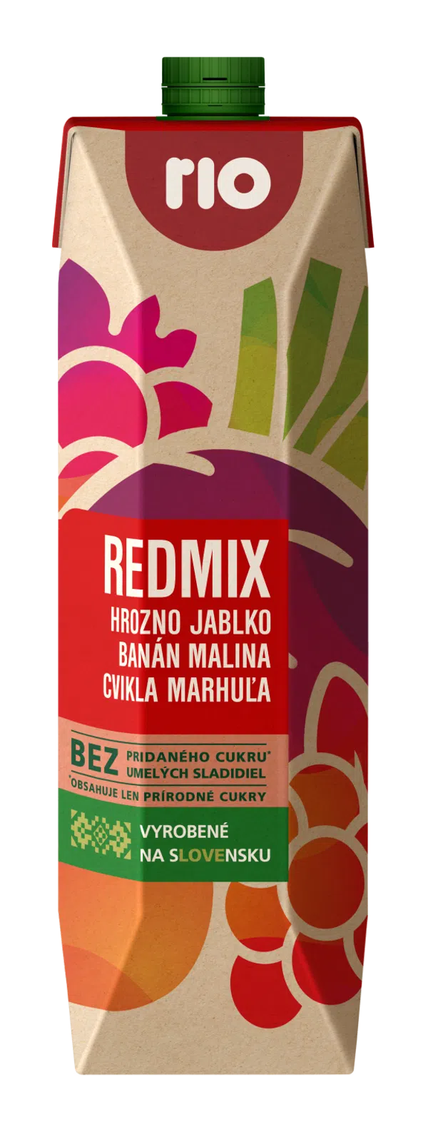 Rio vícedruhový ovocně-zeleninový nápoj v ekologickém obalu z obnovitelných zdrojů. Bez přidaného cukru.