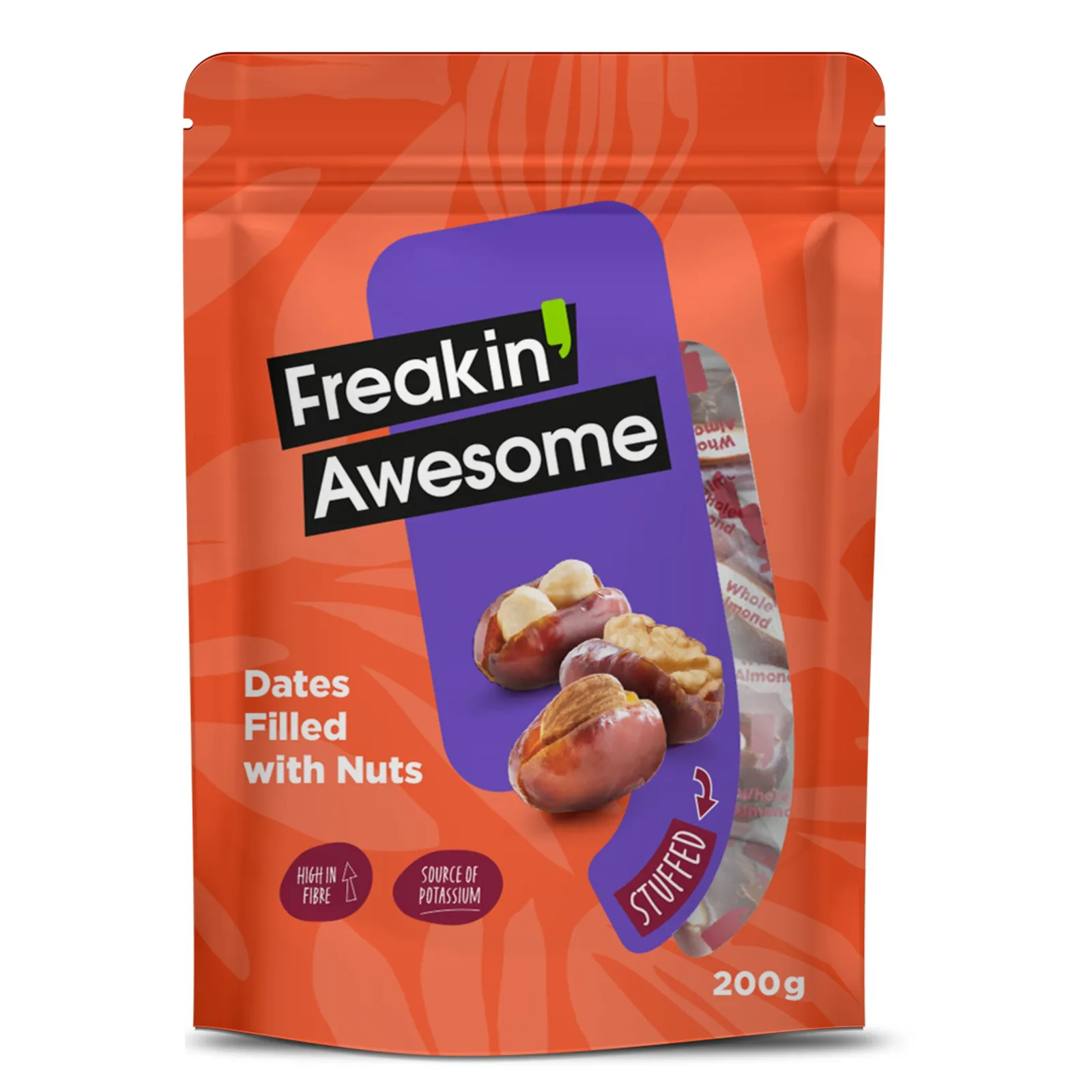 Prémiové datle odrůdy Khalas plněné výběrovými lískovými ořechy, vlašskými ořechy nebo mandlemi.