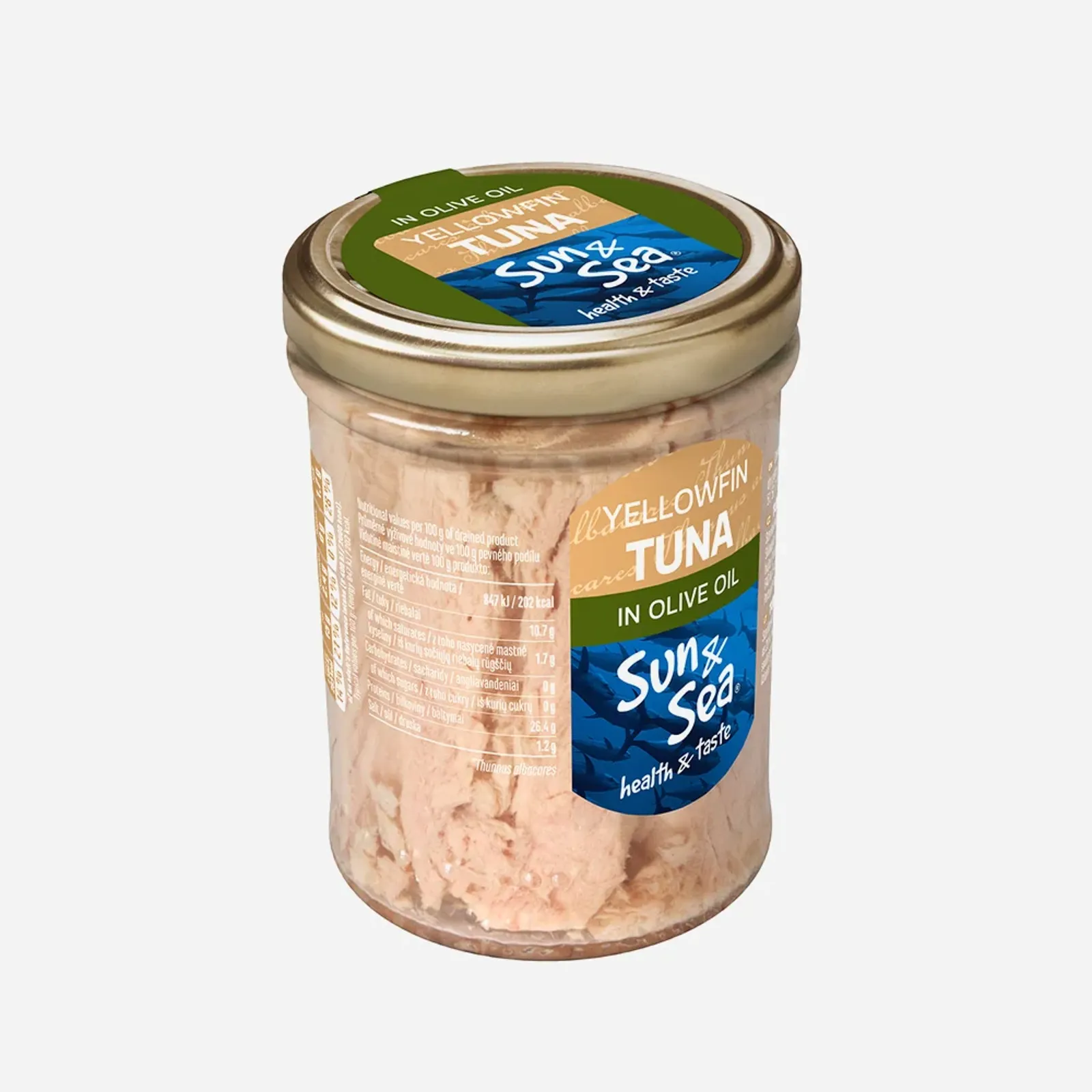 Výborný žlutoploutvý tuňák od Sun and Sea sterilovaný v olivovém oleji je plný živin a především bílkovin.