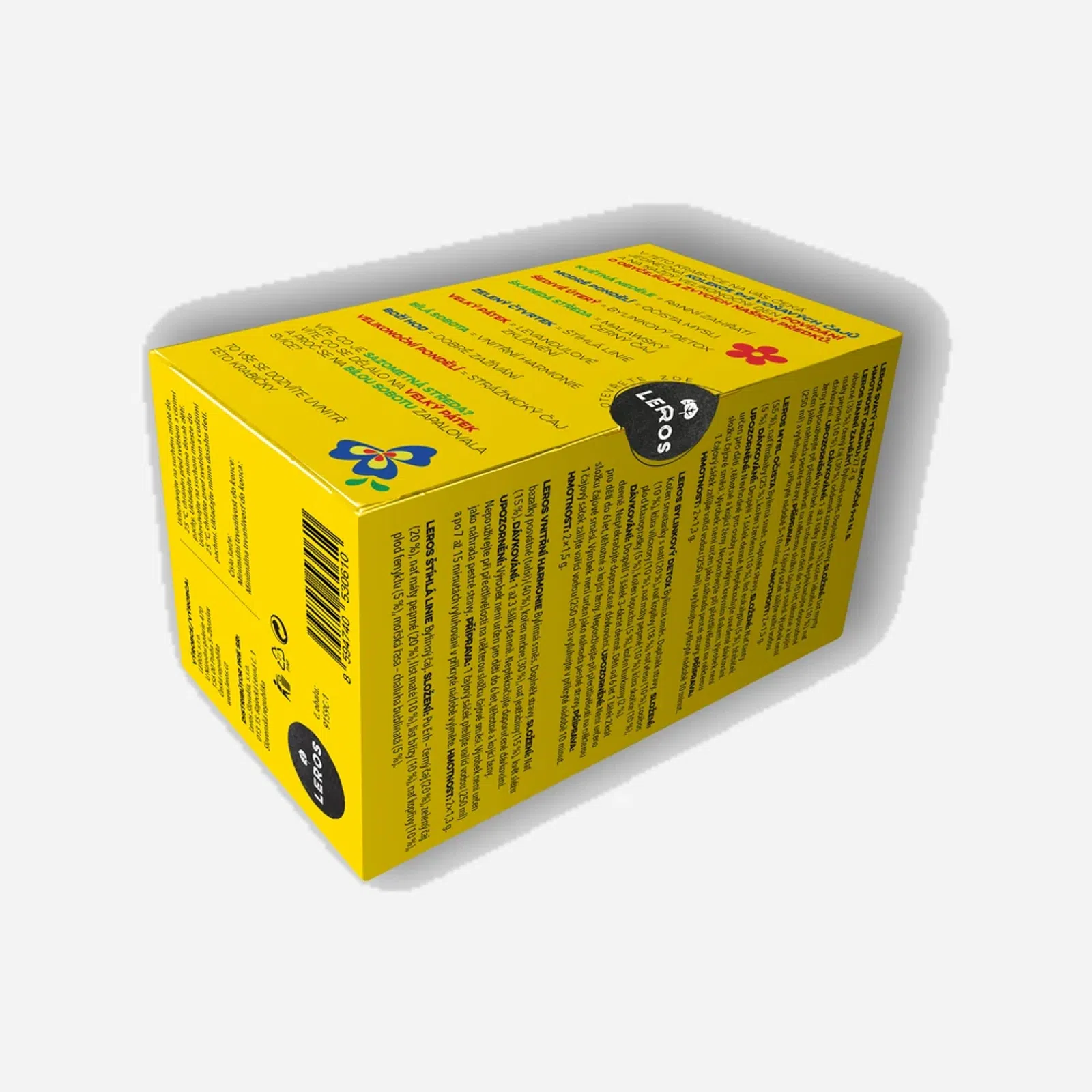 Složení: LEROS RANNÍ ZAHŘÁTÍ Složení: List myrty obecné (35%), černý čaj (30%), oddenek zázvoru (15%), kořen lékořice (10%), nať máty peprné (10%), LEROS MYSL OČISTA složení: Nať šanty (55 %), nať řimbaby (25 %), kořen ženšenu (10 %), list eukalyptu (5 %), hřebíček (5 %), LEROS BYLINKOVÝ DETOX složení: Kořen smetanky s natí (20 %), nať kopřivy (18 %), nať vřesu (10 %), rooibos (10 %), kůra vilcacory (10 %), nať máty peprné (10 %), kůra skořice (10 %), plod klanoprašky (5 %), kořen lopuchu (5 %), kořen kurkumy (2 %), LEROS ČAJOVÝ DÝCHÁNEK – Malawský černý čaj složení: Čaj pravý černý, LEROS VNITŘNÍ HARMONIE složení: Nať bazalky posvátné (tulsi) (40 %), nať jestřabiny (15 %), kořen mrkve (30 %), květ slézu (15 %), LEROS ŠTÍHLÁ LINIE složení: PhuEr - černý čaj (20 %), zelený čaj (20 %), nať máty peprné (20 %), list maté (10 %), list břízy (10 %), nať kopřivy (10 %), plod fenyklu (5 %), mořská řasa – chaluha bublinatá (5 %), LEROS LEVANDULOVÉ ZKLIDNĚNÍ složení: Květ heřmánku (70 %), květ levandule (30 %), LEROS DOBRÉ ZAŽÍVÁNÍ složení: Nať máty peprné (30 %), citronová tráva (20 %), nať mateřídoušky (20 %), plod kmínu (10 %), květ heřmánku (10 %), oddenek zázvoru (10 %), LEROS ČAJ ZE STRÁŽNICE složení: List vinné révy (25 %), jablka (25 %), oplodí šípku (13 %), květ bezu černého (10 %), meduňková nať (10 %), květ sedmikrásky (8 %), kořen pampelišky (7 %), květ chrpy (2 %).