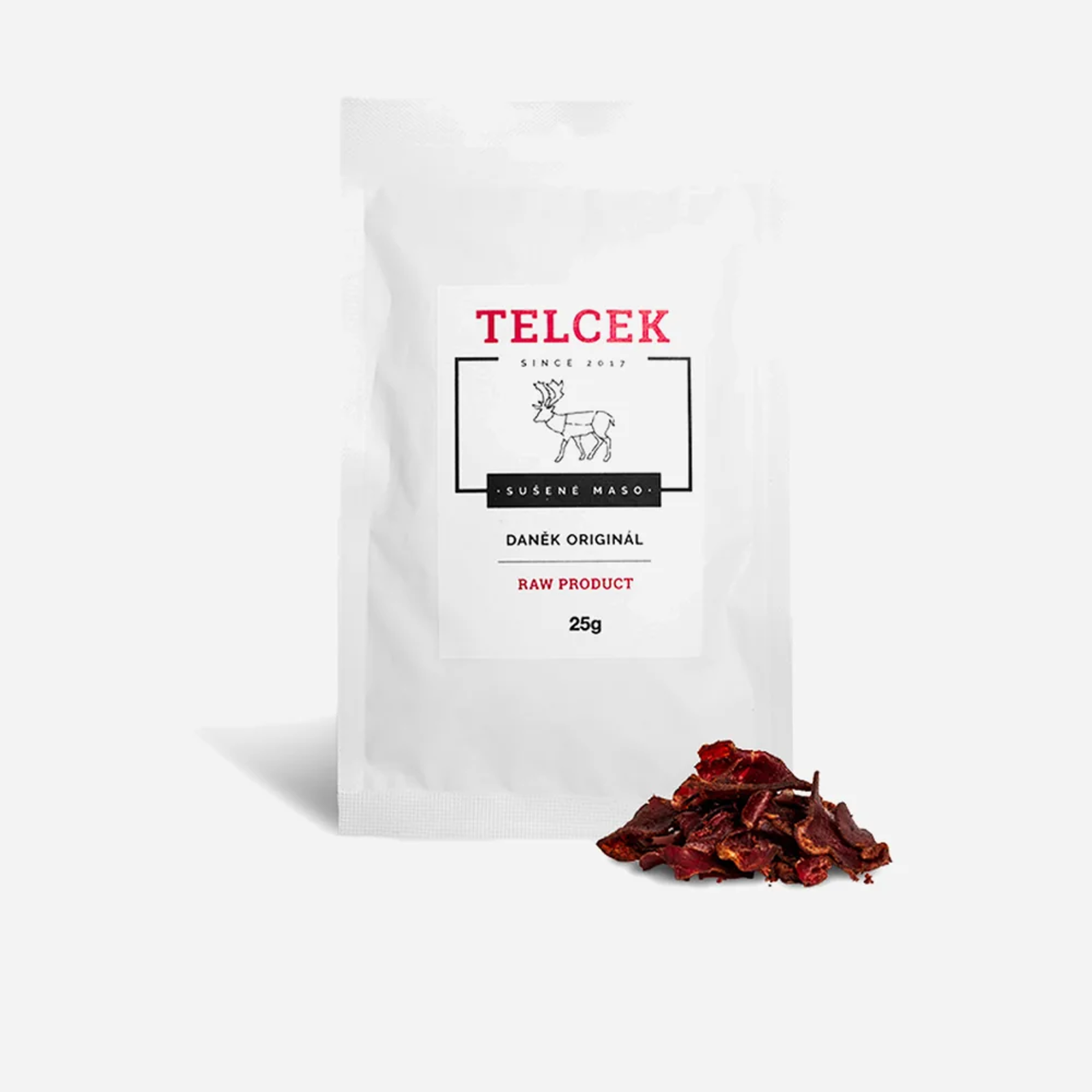 Tento způsob úpravy masa se nazývá Biltong a pochází z jižní Afriky, ale Telcek ho vyrábí v Rejvízu, magickém místě uprostřed Jeseníků. Maso nejprve ošetří, naloží do jedinečné směsi koření a mořské soli, a potom ho nechají 3-6 měsíců zrát v temných komorách pod pečlivou kontrolou. Na rozdíl od většiny ostatních produktů tohoto typu, neurychlují proces zrání masa tepelnou úpravou, což spolu s volbou mladých zvířat, pečlivým výběrem částí masa a umožňuje zachovat šťavnatost a měkčí konzistenci. Tím, že v žádné fázi výroby nepoužívají jakékoli chemické konzervanty a tepelně ho neupravují, splňuje TELCEK klasifikaci RAW FOOD. Zní to až neuvěřitelně, ale 100 gramů sušeného masa odpovídá zhruba 300 gramům syrového masa, se všemi prospěšnými nutričními hodnotami. I malý kousek tak obsahuje pořádný kus energie. Maso ve speciálním obalu vydrží minimálně 48 měsíců od data výroby, při teplotách od -35°C do 35°C, což se hodí při extrémních podmínkách – ať už při sportu, pěším výletu, delší jízdě autem, na kole nebo v kanceláři.