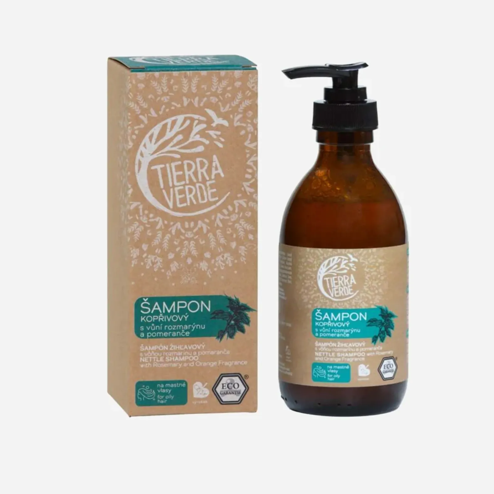 Tierra Verde Šampon kopřivový s vůní rozmarýnu a pomeranče (skleněná lahvička), 230 ml