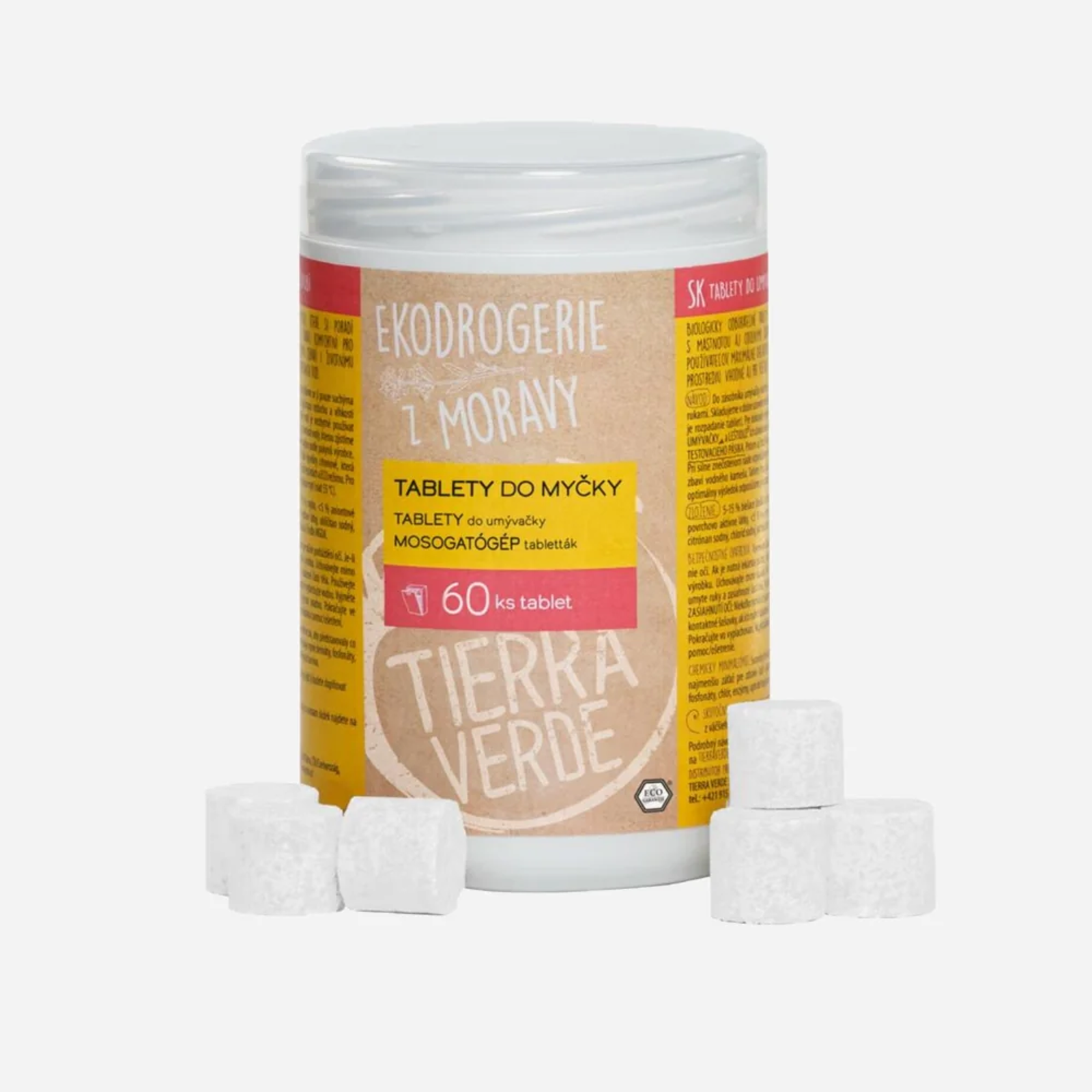 Účinné, udržitelné a uživatelsky komfortní. Tyto tablety do myčky si poradí s mastnotou iodolnými skvrnami. Neobsahují žádné syntetické vůně, které by ulpívaly na nádobí. Díky šetrnému složení vyhovují i čistírnám odpadních vod. Tablety nejsou jednotlivě balené, takže nevzniká zbytečný odpad. Lisuje je repasovaná tabletovačka Láskatož, kterou v Tierra Verde zachránili ze šrotu. Tyto tablety splňují náročná kritéria předního evropského certifikátu Ecogarantie.