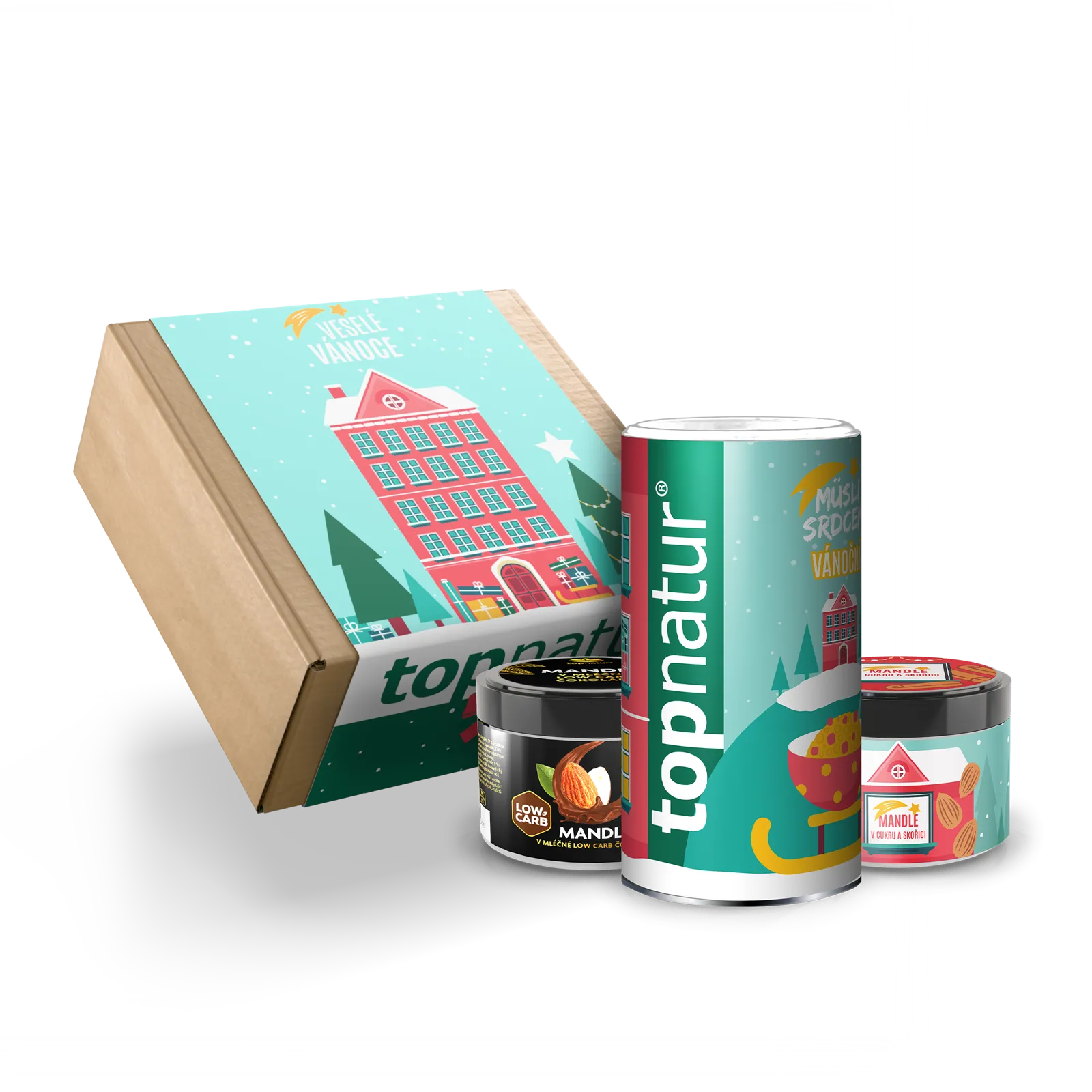 Uvnitř najdete voňavé Müsli srdcem Vánoční perníkové s křupavými oříšky a perníkovým kořením, Mandle z pece v cukru a skořici obalené v jemné sladké krustě a také Mandle v mléčné Low Carb čokoládě – klasiku v odlehčené podobě, která nikdy neomrzí.