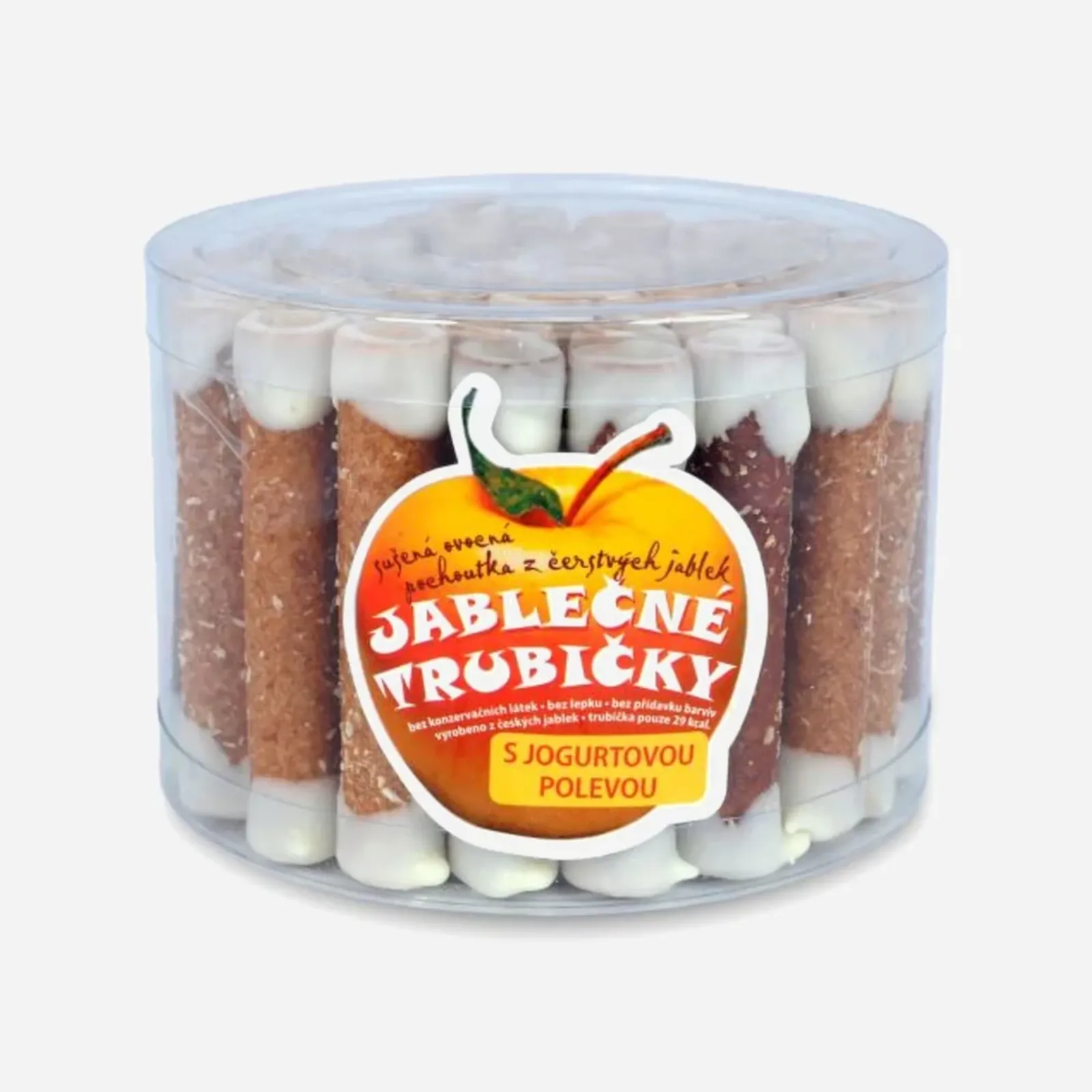 Sušená ovocná pochoutka vyrobená z čerstvých jablek, částečně polévaná jogurtovou polevou.