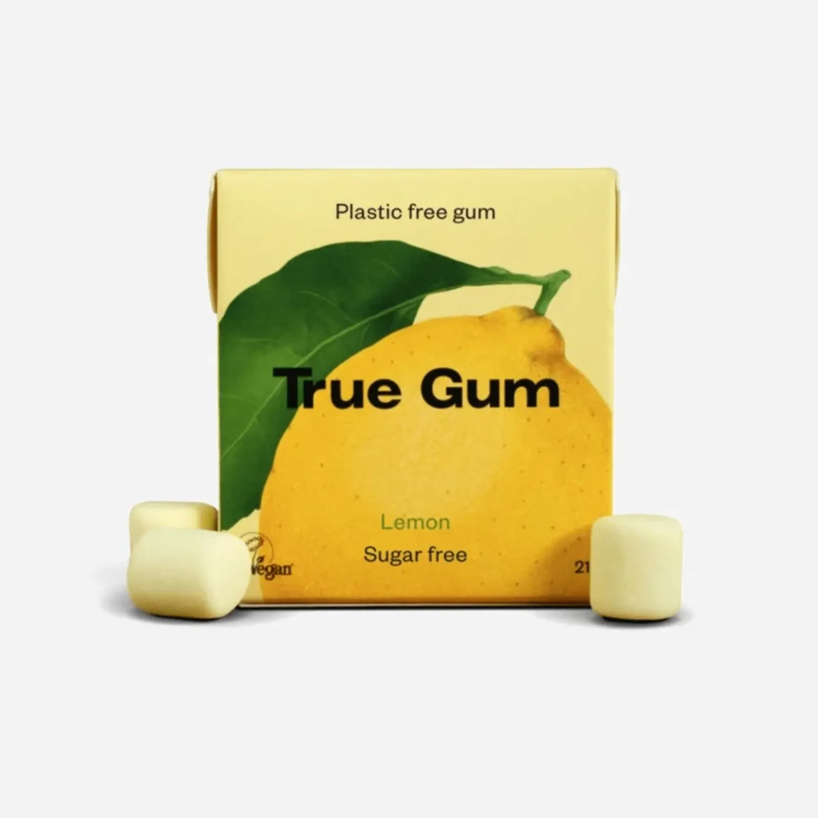 True gum žvýkačka s příchutí citrónu bez plastů, bez aspartamu, bez umělých barviv a slazená xylitolem. Neobsahuje palmový olej a má certifikaci vegan.