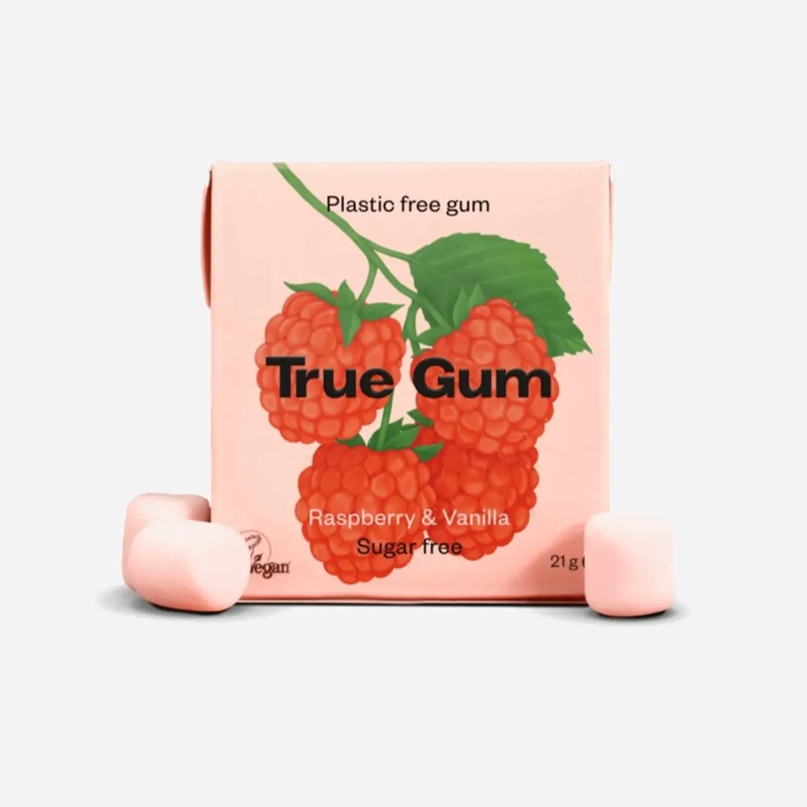 True gum žvýkačka s příchutí maliny a vanilky bez plastů, bez aspartamu, bez umělých barviv a slazená xylitolem. Neobsahuje palmový olej a má certifikaci vegan.