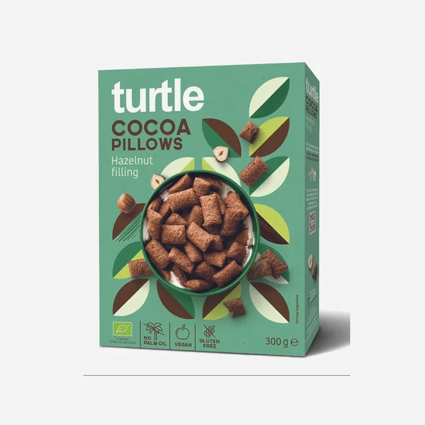 Začněte svůj den s lahodnými Turtle Cocoa Pillows plněnými krémovou náplní z lískových ořechů a kakaa. Tyto organické cereálie jsou bezlepkové, veganské a neobsahují palmový olej, což z nich činí zodpovědnou a chutnou volbu k snídani. Vychutnejte si je s mlékem, rostlinným nápojem nebo jogurtem a dopřejte si sladký začátek dne plný energie. Perfektní pro celou rodinu!