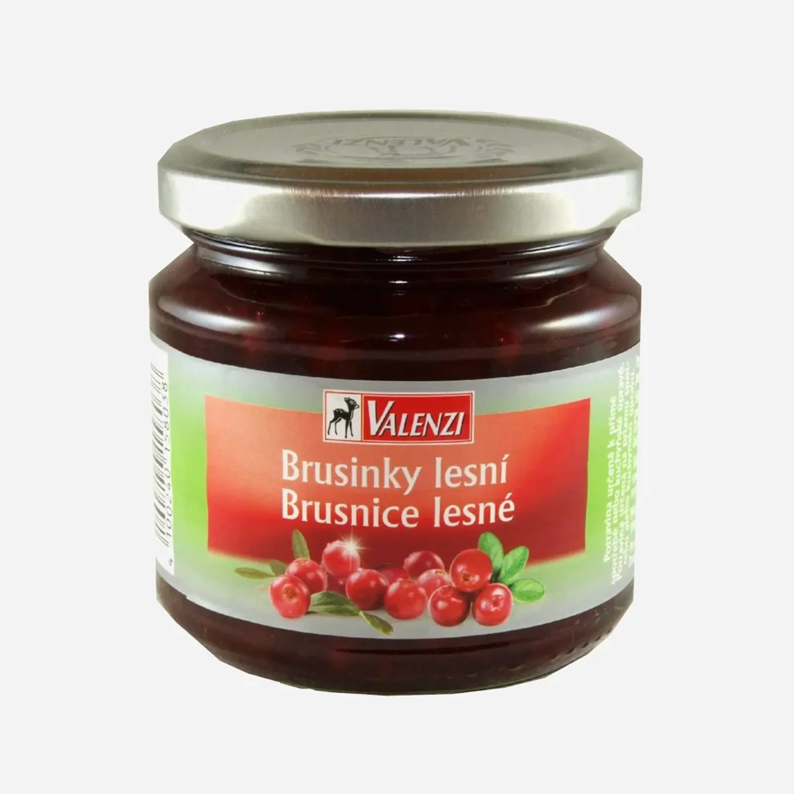 Složení: brusinky lesní (50 %), cukr, glukózo-fruktózový sirup, pitná voda, želírující látka: pektin. Regulátor kyselosti: kyselina citronová