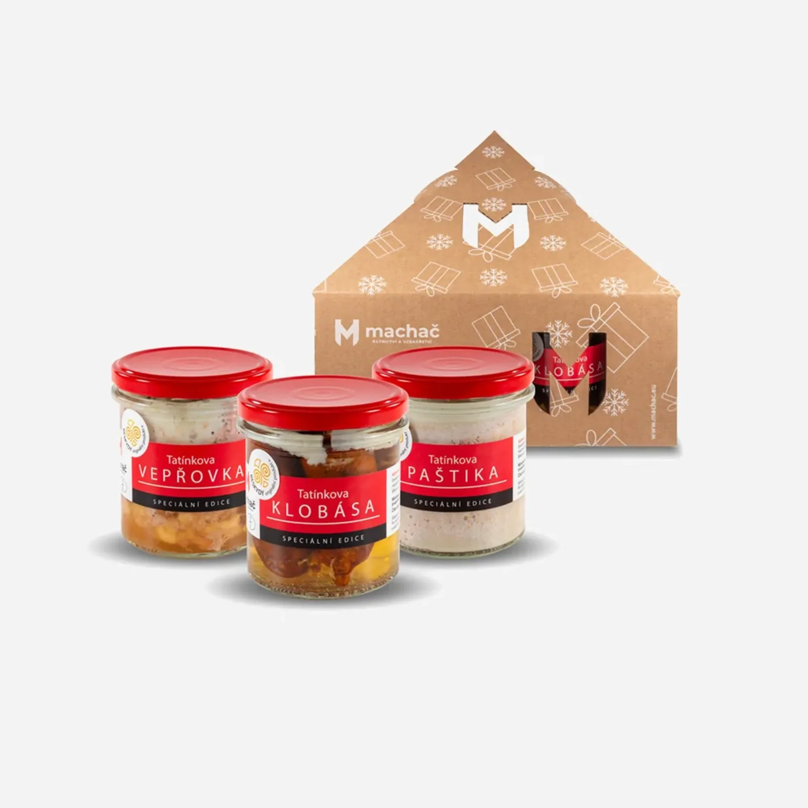 Ideální dárek pro milovníky poctivých domácích dobrot. Sada obsahuje Tatínkovu vepřovku, Tatínkovu klobásu a Tatínkovu paštiku.