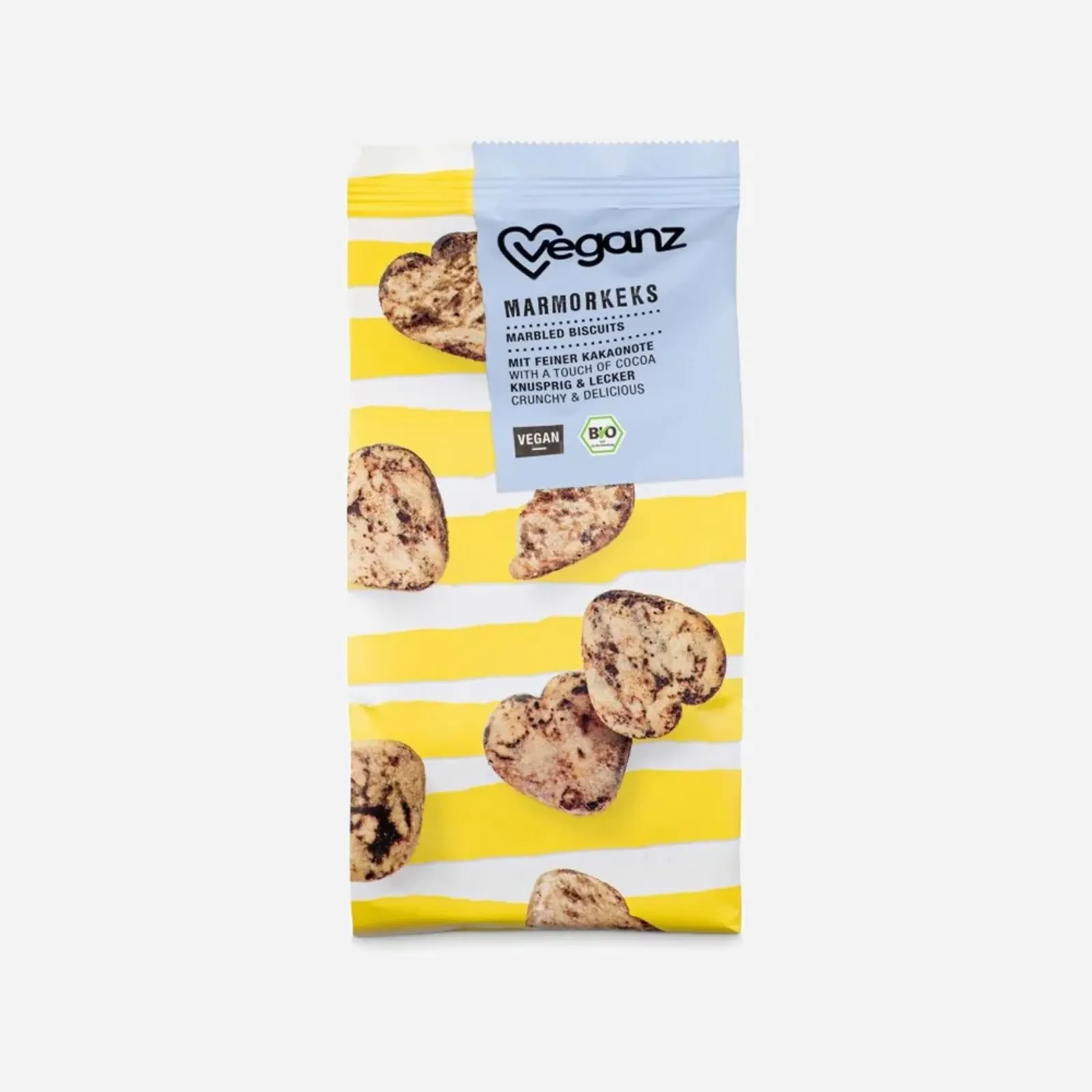 Bio veganské mramorové sušenky ve tvaru srdíček značky Veganz jsou chutné, křupavé a plné kakaa. Obsahují pouze přírodní přísady a jsou vždy skvělou svačinkou. Kombinace kakaa a světlé sušenky se skvěle hodí ke kávě i čaji.
