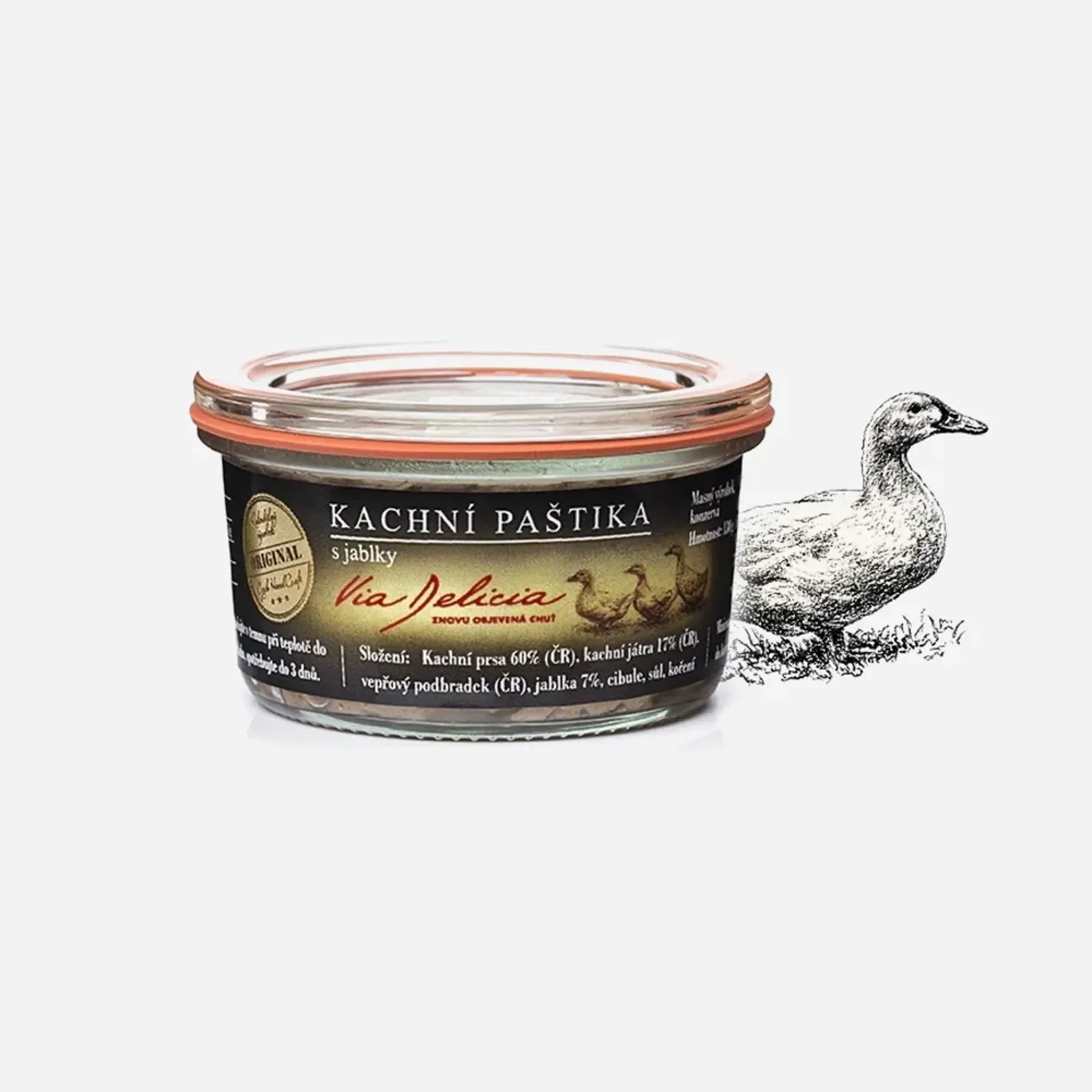 Paštika z kachního masa a kachních jater, doplněná o jablíčka a restovanou cibulku.