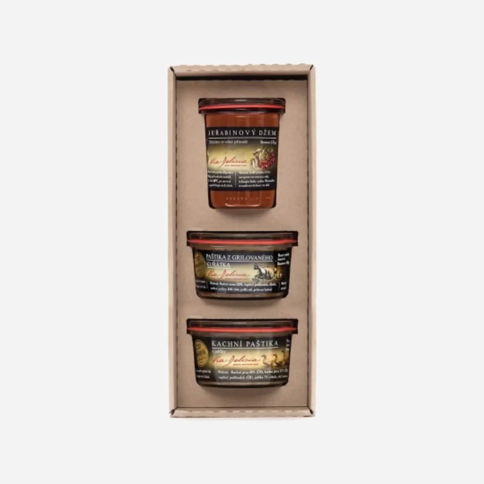 Venkovské trio je dárková kazeta složená ze dvou paštik a jednoho džemu.