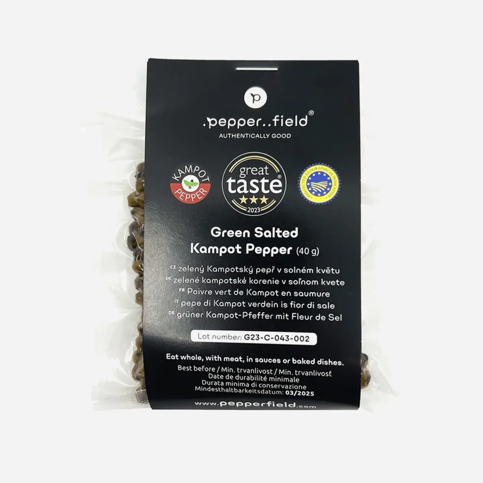 40 g čerstvě sklizených zrn zeleného Kampotského pepře v nálevu z pravého solného květu z Kambodže. Kampotský pepř pochází z produkce malých rodin farmářů, který napřímo dováží česká firma .pepper..field.